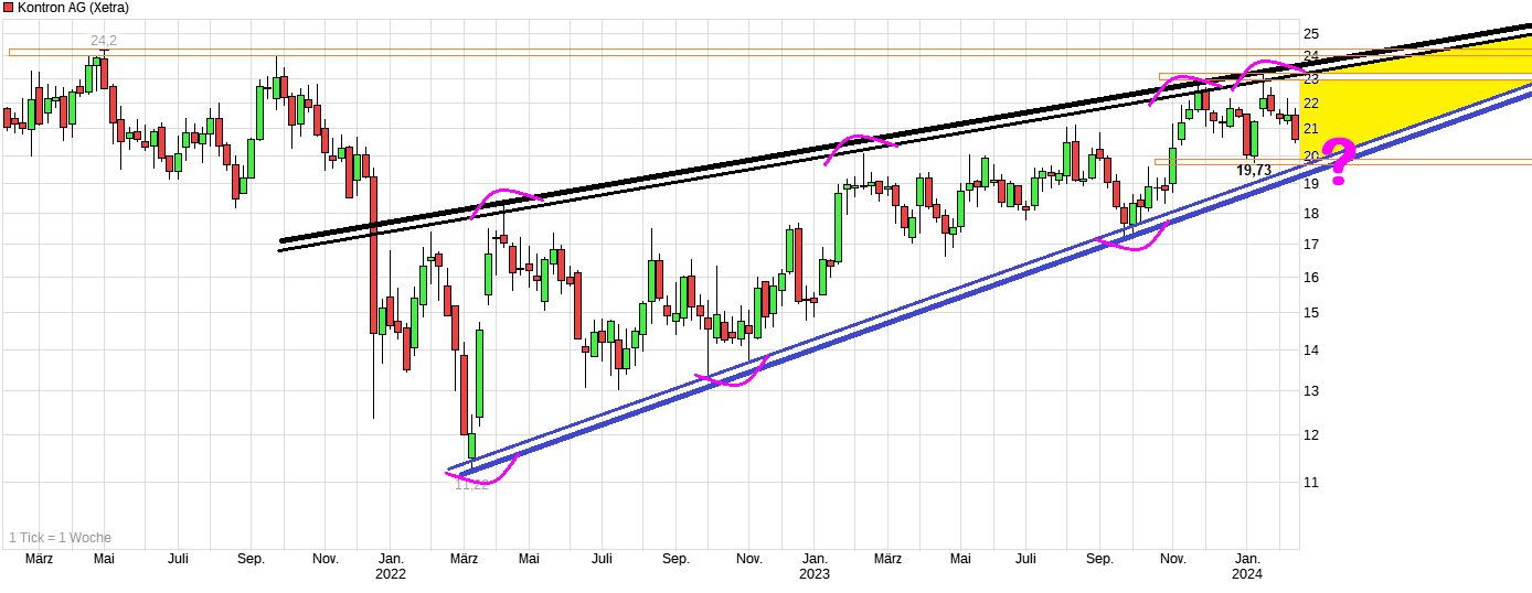 Heute haben die höher als erwartet ausgefallenen Inflationsdaten aus den USA allgemein Tech-Aktien weltweit nach unten gedrückt. Denke  dadurch wird sich vielleicht der erste Zinsschritt nach unten etwas weiter verzögern, aber die Tendenz für das  laufende Jahr sollte trotzdem weiter so sein, daß Zinssenkung spätestens ab Hj.2 auf dem Plan stehen sollten. Kontron pendelt ja nun seit ca. 2 Jahren in einem Keil. Nachdem man oben wieder ankam, war eigentlich zu erwarten, daß dort dann wieder Verkäufe einsetzen würden. Könnte also gut sein man pendelt jetzt wieder zu der unteren Seite dieses Keils, falls man noch etwas weiter verschnupft sein sollte über die Inflationsdaten von heute. Dafür muß es auch nicht unbedingt unter die Unterstützung bei 19,73 gehen. Man käme auch in Kontakt mit dieser Unterseite, wenn man lang genug jetzt mehr oder weniger seitwärts pendeln würde. Unschön wäre nur, wenn man mal nach unten aus dem Keil fallen würde.