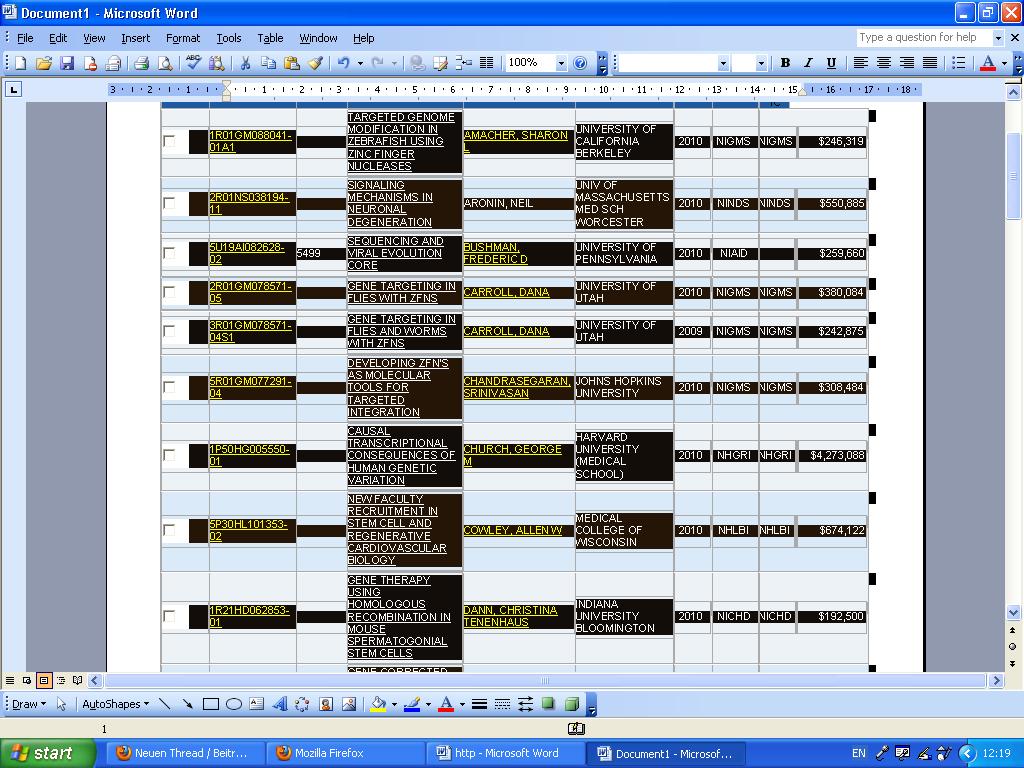 Die Liste lässt ahnen, wie sehr die Zink-Finger-Methode von Sangamo bereits angewandt wird. Und da finden sich ausschließlich Institute der ersten Adresse, Harvard, Berkeley und co