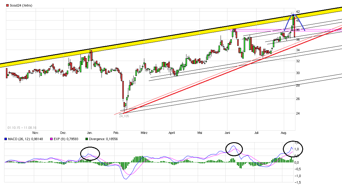 Aktie des Tages: Scout24 mit schwarzem Tag http://boerse.ard.de/aktien/aktie-des-tages/...rzem-tag100~print.html "...Der größte Anteil an Umsätzen entfällt bei Immoblienscout 24 auf sogenannte Kernmakler, also gewerbliche Händler. Die Umsätze in diesem Segment wurden im zweiten Quartal durch eine abnehmende Anzahl von Kernmakler beeinträchtigt. Denn die Händler leiden unter einer Gesetzesänderung: Seit Mitte 2015 gilt für das Engagement eines Maklers das sogenannte Bestellerprinzip. Zuvor konnten Vermieter einen Makler beauftragen und dessen Honorar auf die zukünftigen Mieter umlegen. Mittlerweile muss der Besteller die Kosten für den Makler tragen. Sinkende Aufträge für Makler bedeuten allerdings auch sinkende Aufträge für Immobilienscout. Die Gesamtzahl der Anzeigen ist im Vergleich zum Vorjahr um vier Prozent geschrumpt.