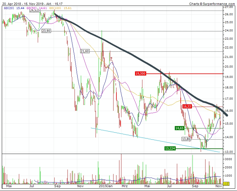 Aber wann wird der Trend gebrochen? Aktuell sieht es eher nach einem weiteren Rückgang auf die 12,90-13,00€ aus.