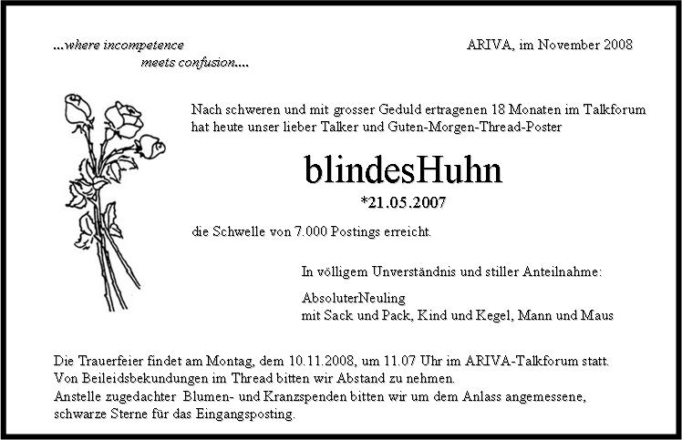 | eröffnet am: | 10.11.08 11:07 von: | blindesHuhn | Anzahl Beiträge: | 19 |