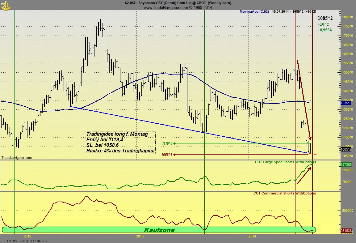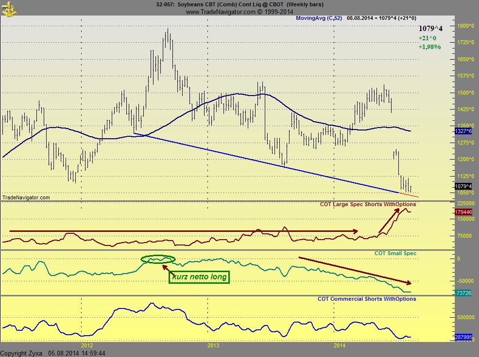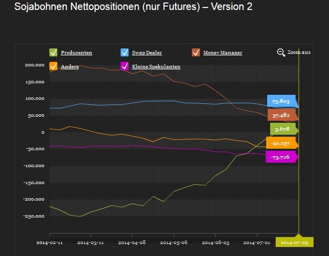 Ich hab mir mal die small Specs genauer angesehen. Die Small waren eigentlich bis 2005 durchwegs immer netto Long positioniert, seit 2005 sind die small immer, bis auf einen kurzen Moment mitte 2012 netto Short. Jetzt haben sie einen all Time netto-short Reckord mit 73k Kontrakten, mann sieht schon das ist ne menge Holz, Weizen wird von sehr vielen kleinen Trader, aber auch Farmer die nicht in die Meldepflicht für Commercials fallen gehandelt. Die Fonds verhalten sich mit ihren Shorts eigentlich immer neutral, am 30.5.2014 plötzlich werde sie zu riesen Shorter, von 75k auf 180k Kontrakten....irre
