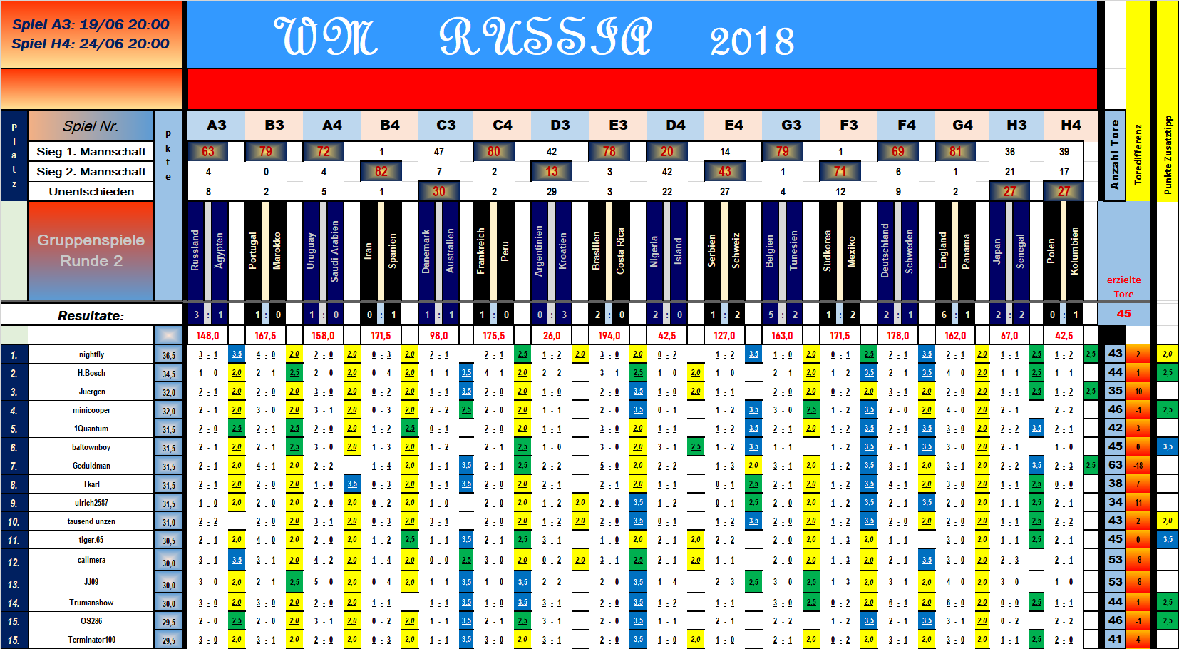 Die Tipps werden in der Grafik nach Spiel 12 : Südkorea-Mexiko eingefügt. 3:0 (Gr.A) Russland RUS-EGY Aegypten (Di, 19.06.2018, 20:00) 3:0 (Gr.B) Portugal POR-MAR Marokko (Mi, 20.06.2018, 14:00) 2:0 (Gr.A) Uruguay URU-SAA Saudi-Arabien (Mi, 20.06.2018, 17:00) 0:4 (Gr.B) Iran IRN-ESP Spanien (Mi, 20.06.2018, 20:00) 2:0 (Gr.C) Dänemark DEN-AUS Australien (Do, 21.06.2018, 14:00) 3:1 (Gr.C) Frankreich FRA-PER Peru (Do, 21.06.2018, 17:00) 1:0 (Gr.D) Argentinien ARG-CRO Kroatien (Do, 21.06.2018, 20:00) 3:0 (Gr.E) Brasilien BRA-COS Costa Rica (Fr, 22.06.2018, 14:00) 0:2 (Gr.D) Nigeria NGA-ISL Island (Fr, 22.06.2018, 17:00) 1:2 (Gr.E) Serbien SRB-SUI Schweiz (Fr, 22.06.2018, 20:00) 1:0 (Gr.G) Belgien BEL-TUN Tunesien (Sa, 23.06.2018, 14:00) 0:1 (Gr.F) Südkorea SKR-MEX Mexiko (Sa, 23.06.2018, 17:00) 2:1 (Gr.F) Deutschland DEU-SWE Schweden (Sa, 23.06.2018, 20:00) 3:1 (Gr.G) England ENG-PAN Panama (So, 24.06.2018, 14:00) 1:0 (Gr.H) Japan JAP-SEN Senegal (So, 24.06.2018, 17:00) 1:2 (Gr.H) Polen POL-COL Kolumbien (So, 24.06.2018, 20:00) |