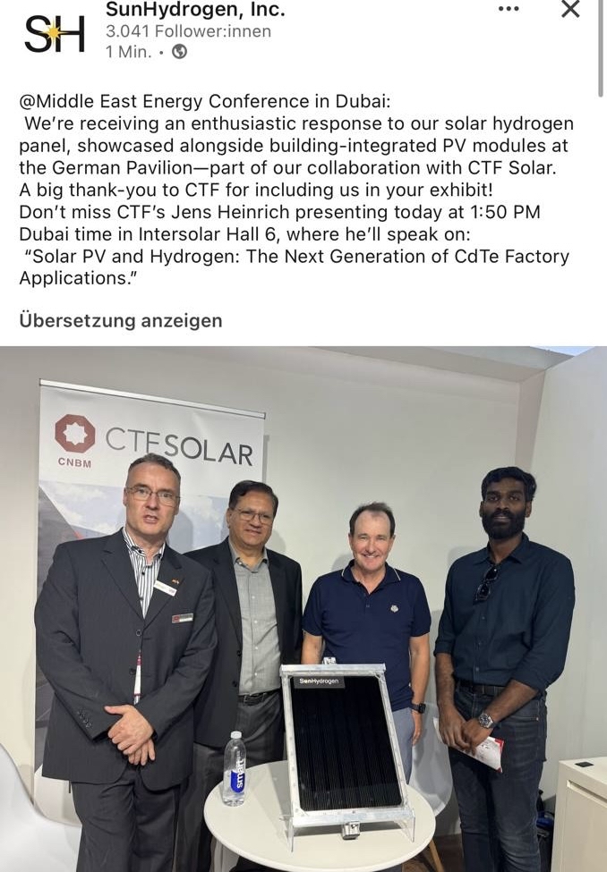 Im Rahmen der begleitenden Intersolar Middle East Conference hielt Dr. Jens Heinrich, stellvertretender Geschäftsführer und Leiter der Technologieentwicklung bei CTF Solar, einen Vortrag über die Entwicklung der direkten Wasserstoff-Elektrolyse auf CdTe-Solarmodulen. Sein Vortrag verdeutlichte das praktische Potenzial der CdTe-Technologie für eine effiziente Wasserstoffproduktion mit Hilfe von Solarenergie.