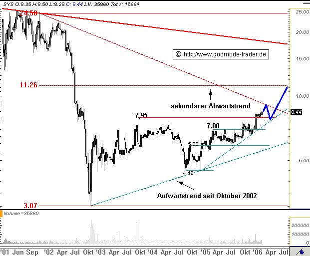 Diagnose: Die SYSKOPLAN Aktie befindet sich seit Oktober 2002 in einem Aufwärtstrend. In der Woche vor Weihnachten 2005 durchbrach die Aktie mit einer langen weißen Kerze das bisherige Bewegungshoch bei 7,95 Euro. Seitdem hat sich die Aktie oberhalb dieser Marke etabliert. Zuerst lief die Aktie nur seitwärts, in der letzten Woche strebte sie etwas nach oben. Bei 9,15 Euro liegt aktuell der sekundäre Abwärtstrend seit Oktober 2001.