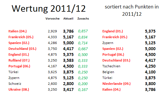 obwohl wir jetzt noch guten Vorsprung ab nächste Saison gegen Italien haben, geht es schon wieder für uns bergab. Wenn unsere so hochgelobten Bundesliga-Überflieger (Mainz ist ja schon weg, genau wie 1x Italien Udine) aus der letzten Saison nicht noch die Kurve kriegen, wird die Saison 2011/2012 punktemäßig eine ganz maue Sache für D!