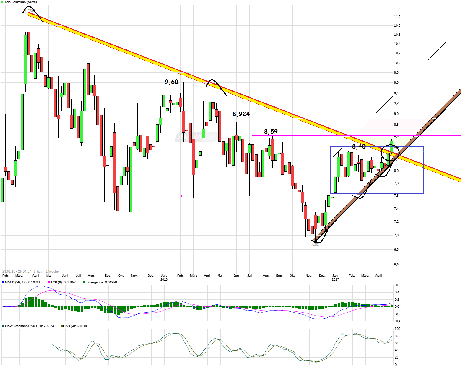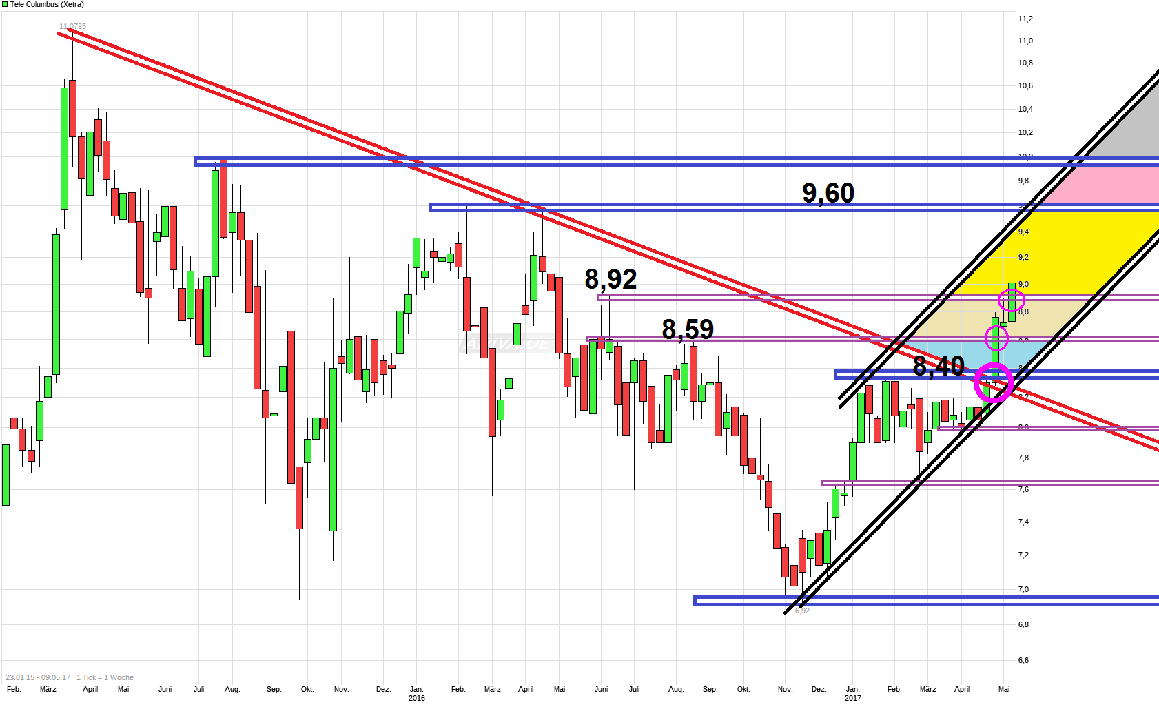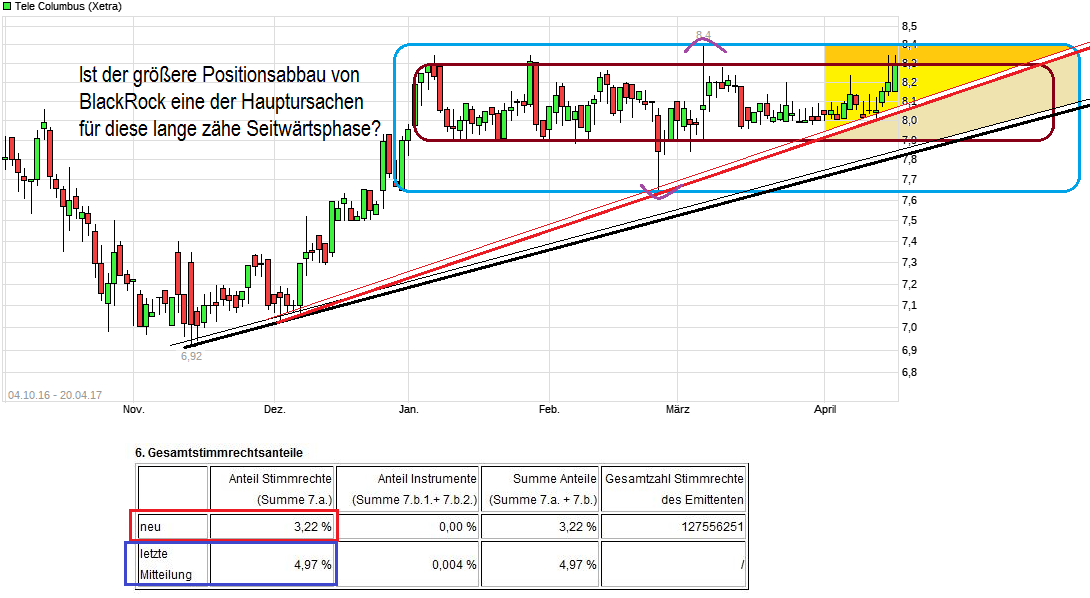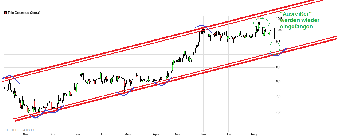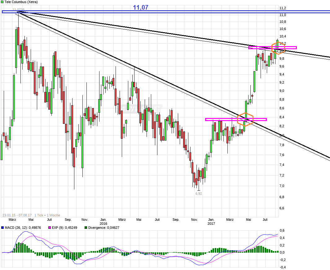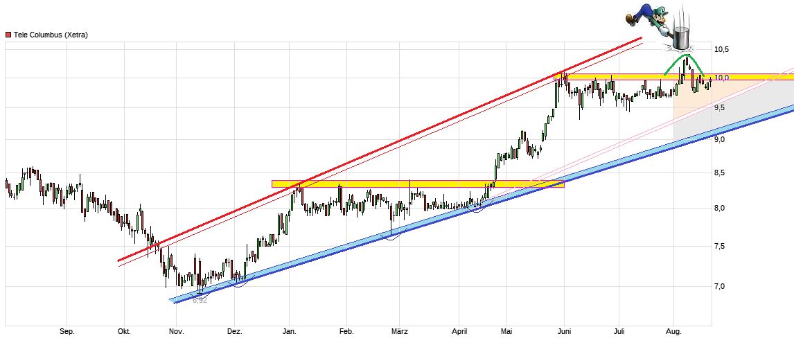 Der "Befreiungsschlag" im April, mit Break der 8,40 und knacken des langfristigen Abwärtstends, zeigt noch immer seine Nachwirklung. Nachdem die 8,40 und die 8,59 als horizontale Marken schon rausgenommen wurden, hat man jetzt auch die 8,92 nach oben durchbrochen. Sollte man sich darüber nun auch halten können, dann wäre weitere Luft bis zur nächsten größeren Marke bei ca. 9,60. Könnte ich mit leben, wenn es so käme ;) Am 19. Mai gibt es dann endlich die terminlich zuvor verschobenen Zahlen ( ...Berlin, 27. April 2017. Die Tele Columbus AG, der drittgrößte deutsche Kabelnetzbetreiber, hat heute eine Änderung ihres Finanzkalenders bekanntgegeben: Die Veröffentlichung des geprüften Konzernabschlusses für das Geschäftsjahr 2016 verschiebt sich vom 28. April auf den 19. Mai 2017; die für den 9. Juni geplante ordentliche Hauptversammlung ist nun für den 21. Juni 2017 angesetzt. ... ) und die neuen Prognosen. Mal schauen, ob die Vorfreude die der Kurs gegenwärtig schon zeigt (Insider?), dann auch die entsprechenden Zahlen/Prognosen bekommt, um diese Freude noch weiter zu bestätigen.