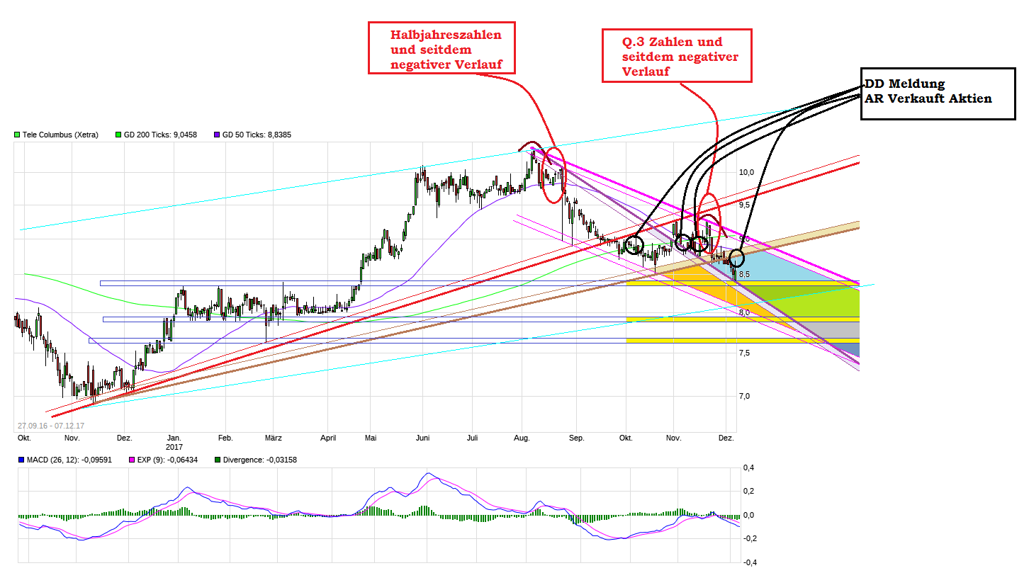 bzw. die Director´s Dealings mal wieder gezeigt, daß die Insider schon früher wußten was kommen würde nach den Q.3 Zahlen. Nachdem schon die Halbjahreszahlen nicht wirklich die Erwartungen befriedigen konnten (die fallenden Kurse danach sind ja der Beleg), haben die Q.3 Zahlen leider diese negative Tendenz weiter bestätigt. Entsprechend wurde in den Wochen vor den Q.3 Zahlen von Insidern noch fix abgeladen. Wo bleiben denn mal jetzt nenneswerte Zukäufe von Vorstandsmitgliedern als Beweis sie glauben selber an steigende Kurse? Wie soll man außenstehende Marktteilnehmer zum kaufen bewegen, wenn Vorstand und AR nichts von der Aktie hält in Kursregionen von 9€ oder mehr? Jetzt vor wenigen Tagen nach den Q.3 Zahlen schon wieder die nächste DD Verkaufsmeldung :( Soll man das so interpretieren, daß auch Q.4 nichts taugen wird? Leider wurden Aufwärtstrends gebrochen und die Abwärtstrends sind weiter intakt. Bin daher auch seit einiger Zeit hier raus. Neue Kaufsignale/belastbarer Boden sind noch nicht zu sehen und auch keine Vertrauensbeweise des Managements. Aktuell ist man jetzt wieder in den Bereich zurückgelaufen wo die Tops von Januar-März 2017 lagen. Könnte vielleicht etwas horizontale Unterstützung geben. Umgekehrt wäre ein Break dieser Marken ein weiteres negatives Zeichen und man würde wieder in diese alte Seitwärtsbewegung vom Jahresanfang reinsacken. Von daher scheint es vielleicht besser zu sein erst die nächsten Zahlen( + Reaktionen darauf) im kommenden Jahr abzuwarten oder zumindest klare Breaks der Abwärtstrends bevor man hier wieder Geld investiert. Wie gesagt: Wenn das Management nicht an die Aktie glaubt (bzw. eigenes Geld auf dem Kursniveau nicht dafür ausgeben will), warum sollten es dann Außenstehende?