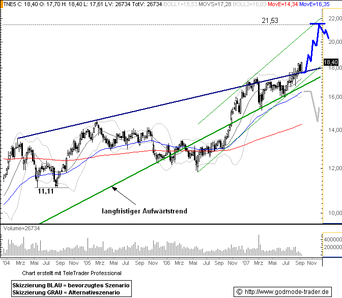 Rückblick: Die TELFONICA - Aktie startete nach einem Tief bei 7,46 Euro im Oktober 2002 zu einer langfristigen Aufwärtsbewegung. Ein erstes wichtiges Zwischenhoch erreichte der spanische Telekommunikationswert im Februar 2005. Nach einer Korrekturphase bis Mai 2006 auf ein Tief bei 11,83 Euro startete eine starke Aufwärtsphase. Diese Rallye erfährt jetzt durch einen Ausbruch über wichtige Pullbacklinien neuen Schwung.