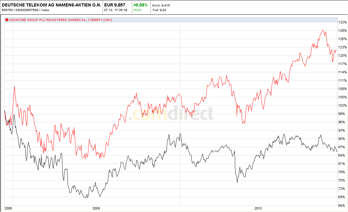 Ich denke, dass Titel die zum einschlafen sind auch Ihre guten Seiten haben. Gerade oder erst Recht wenn das Unternehmen so groß ist wie die Telekom. Fahre in den letzte 2 Jahren mit Zertifikaten immer super mit der Telekom (siehe auch ältere Posts von mir) Aktuell hab ich mir wieder 2 ins Depo gelegt gestern. Laufzeit jedesmal bis 06/11. Einmal Barriere 7,50 € und einmal die 8 €. Bei der 8 € gabs gestern eine Seitwertsrendite von ca. 20%. bei 7,50 € immerhin ca. 15%. Das mit 8 € ist heut auch gleich um über +2 % gelaufen. Wem das zu wenig ist, der ist bei der Telekom sowiso "falsch verbunden" :) Die 8,50 sollten erstmal sicher sein auf 1/2 Jahr gesehen. Gerade wegen der Dividende die immerhin "garantiert" wurde mit 0,70. Wenn es mit der Wirtschaft so weiter geht und die Märkte noch laufen, hoffe ich auf ein finales durchbrechen der 10,60 Marke bis Luft zur 12. Ansonsten muss ich zugeben, dass mir etwas die Gründe/Fantasie fehlt warum die Telekom auf 15, 16 usw. laufen sollte. Denk die Range der letzten 2 Jahre bleibt uns noch etwas erhalten :) |