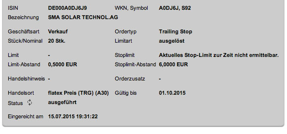 ich habe vor kurzem bei Flatex eine Order als Trailing Stop Limit aufgegeben. Aktie war SMA Solar Technology. Die Details habe ich als Screenshot der Order (hoffe das klappt) angehängt. Als ich die Order bei Flatex eingestellt habe, war der Kurs etwa bei 36, mein Stop-Limit habe ich auf 27 Euro gesetzt, da ich bei 27 Euro oder darunter verkaufen wollte. Da es kein Stop-Loss, sondern Stop-Limit Order war, musste ich noch einen Limit-Abstand angeben. Da ich möglichst genau zu 27 Euro und nicht weiter drunter verkaufen wollte, habe ich diesen mit 0,5 EUR angegeben. Die Order wurde dann gestern schon ausgeführt, am Kursverlauf kann ich aber nicht erkennen, dass er mein Stop-Limit von 27 Euro (oder drunter) erreicht hat. Warum wurde die Order ausgeführt? Sicherlich hab ich wohl das mit dem Trailing-Stop noch nicht verstanden, was hab ich falsch gemacht? |
