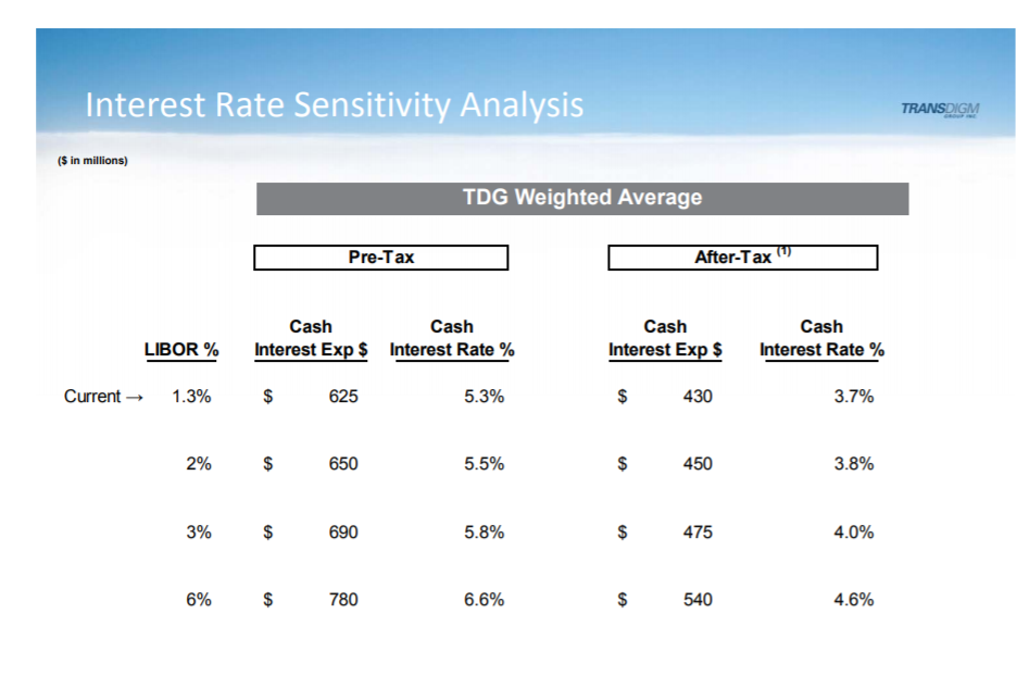 Dabei bedeute ein Anstieg der variablen Zinsen um 100 Basispunkte (1,0 Prozentpunkte) zusätzliche Zinsbelastungen von 60 Millionen Dollar für das laufende Fiskaljahr. Demnach bedeute ein variabler Zinssatz von 5,0 Prozent Zinszahlungen von 1,575 Milliarden Dollar, bei 6,0 Prozent wären es 1,635 Milliarden Dollar.