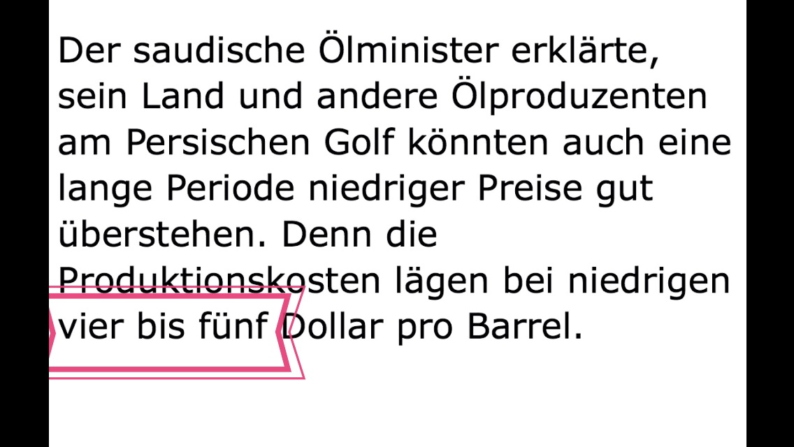Die Saudis fördern ca. für 5$ den Barrel. Kosten(Personal, Transport, etc.) liegen bei ca.20$. Beim jetzigen Ölpreis immer noch ein Gewinn von ca.20$.