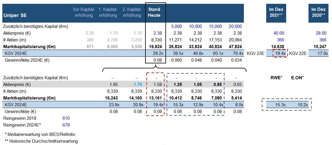 Falls Unipers Probleme am 31. Dezember, also in 3 Tagen, nicht plötzlich gelöst sind, wird das Unternehmen noch mehr Kapital brauchen, genauer gesagt bis zu 19.5mrd zusätzlich (die ersten 5.5mrd der insgesamt angekündigten bis zu 25mrd wurden in den letzten Tagen abgerufen). Weitere Kapitalerhöhungen würden den fairen Preis wegen Verwässerung weiter senken.
