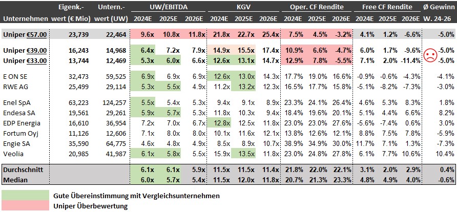 Im Resultat ist Uniper heute noch überbewerteter als vor einem Monat: Mit einem EBITDA 2024E Multiple von 9.6x ist Uniper teurer als jeder andere Wettbewerber und der Unternehmenswert (Enterprise Value) ist 57% teurer als der Durchschnitt. Auf KGV Ebene sieht es noch schlechter aus. Uniper's Aktien sind mit einem KGV 2024E von 21.8x 90% teurer als der Durchschnitt.