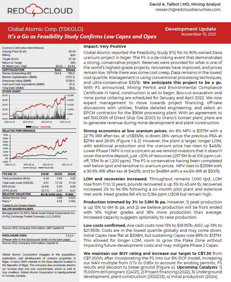Global Atomic plans to break ground at Dasa in January 2022 and begin underground development in April. The processing plant is to be commissioned by the end of 2024. The project is already fully permitted.
