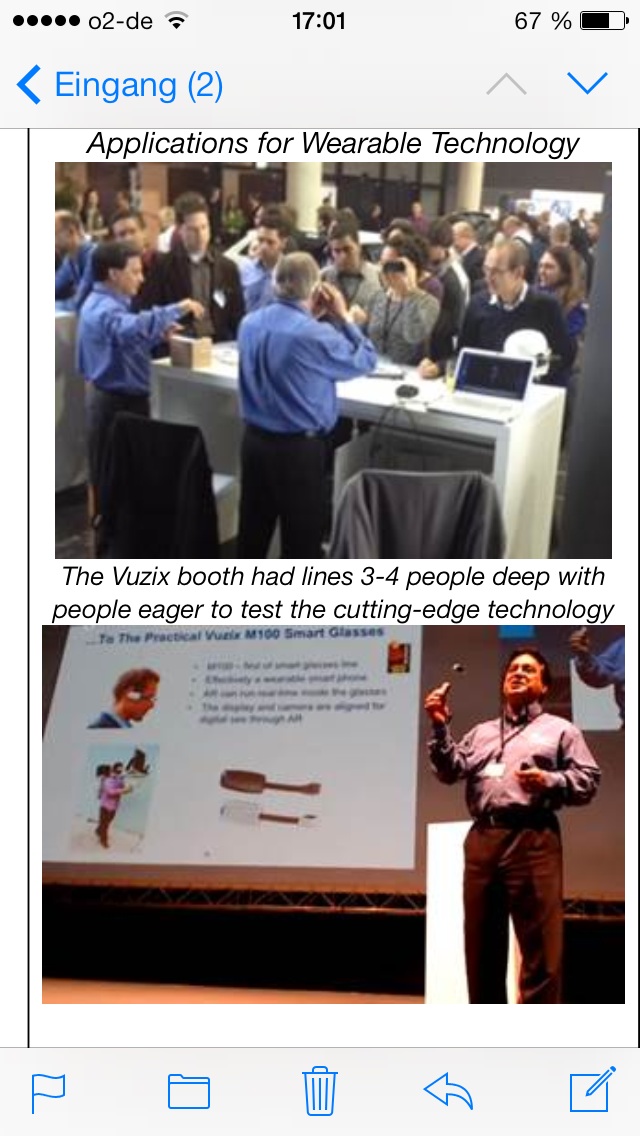 With the morning of the first day being titled 'The Wearable Computing Forecast', it hones in on smart glasses discussions, developments in smart glasses AR applications and uses within a variety of markets. Vuzix session will focus on how Vuzix' M100 works within the enterprise sector - which will be further enhanced later in the day when SAP, the market leader in enterprise application software, and SITA, the world's leading specialist in air transport and communications IT, show use cases for apps running on the M100 within specific markets.