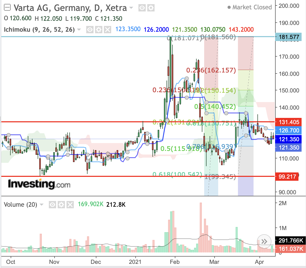 Weil es bei Varta an Kriterien für einen Squeezeeffekt fehlt, wird ein Anstieg nur mit nachwachsendem Kaufinteresse und gleichzeitigem Runtergeshorte in herkömmlichen Chartmustern vonstattengehen können.