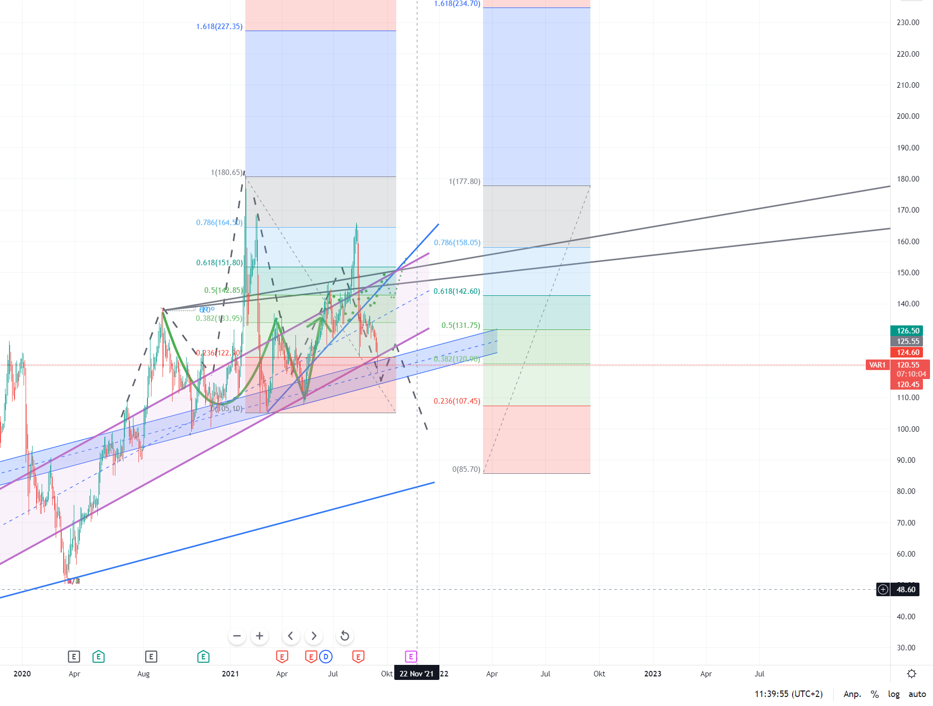 Ich erkenne folgende Marken: BBu ca 132 und lila Trendlinie ca 128