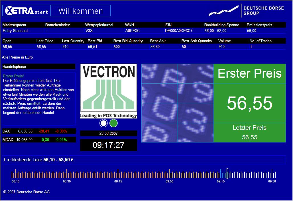 Der Kassenhersteller Vectron wage sich erneut an die Börse. Die Gesellschaft sei schon einmal zur Spitzenzeit der New Economy an der Börse gewesen. Dann sei die Hansa Chemie auf Vectron verschmolzen worden. Der Kassenhersteller sei fortan ein umsatzmäßig eher unbedeutender Teil des Gesamtunternehmens gewesen. Allerdings sei die Firma im Schatten der großen Mutter gut gediehen und im März 2006 hätten die Manager das Unternehmen wieder heraus gekauft.