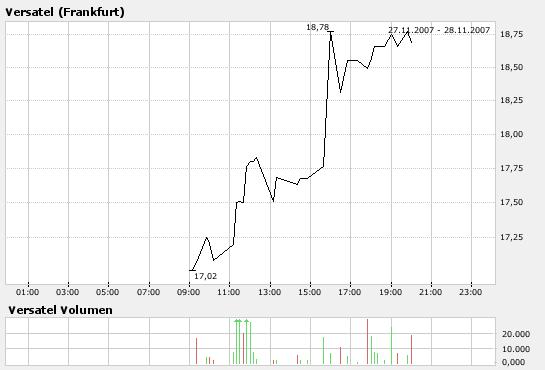 Da nach Ansicht der Analysten eine Übernahme von Versatel aber Sinn machen würde, dürften entsprechende Spekulationen den Aktienkurs unterstützen. Nach den starken Kursanstiegen in den letzten Tagen verbleibe aber nur noch ein Aufwärtspotenzial von 7,9%.