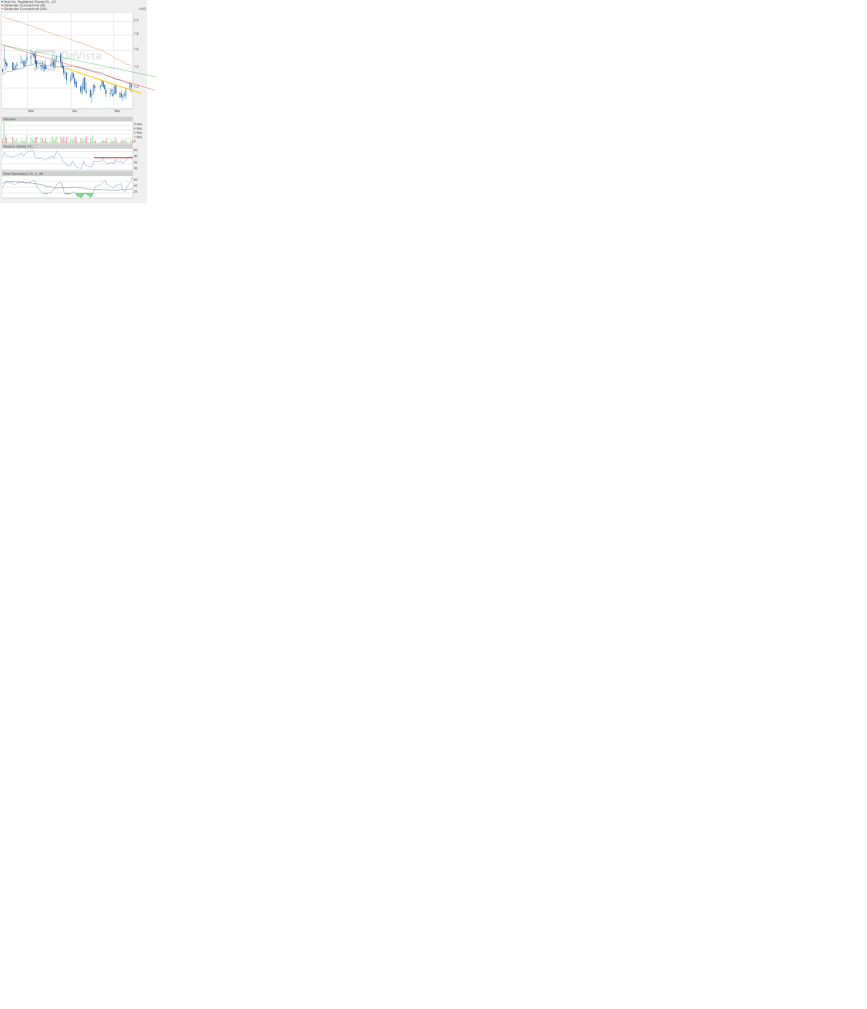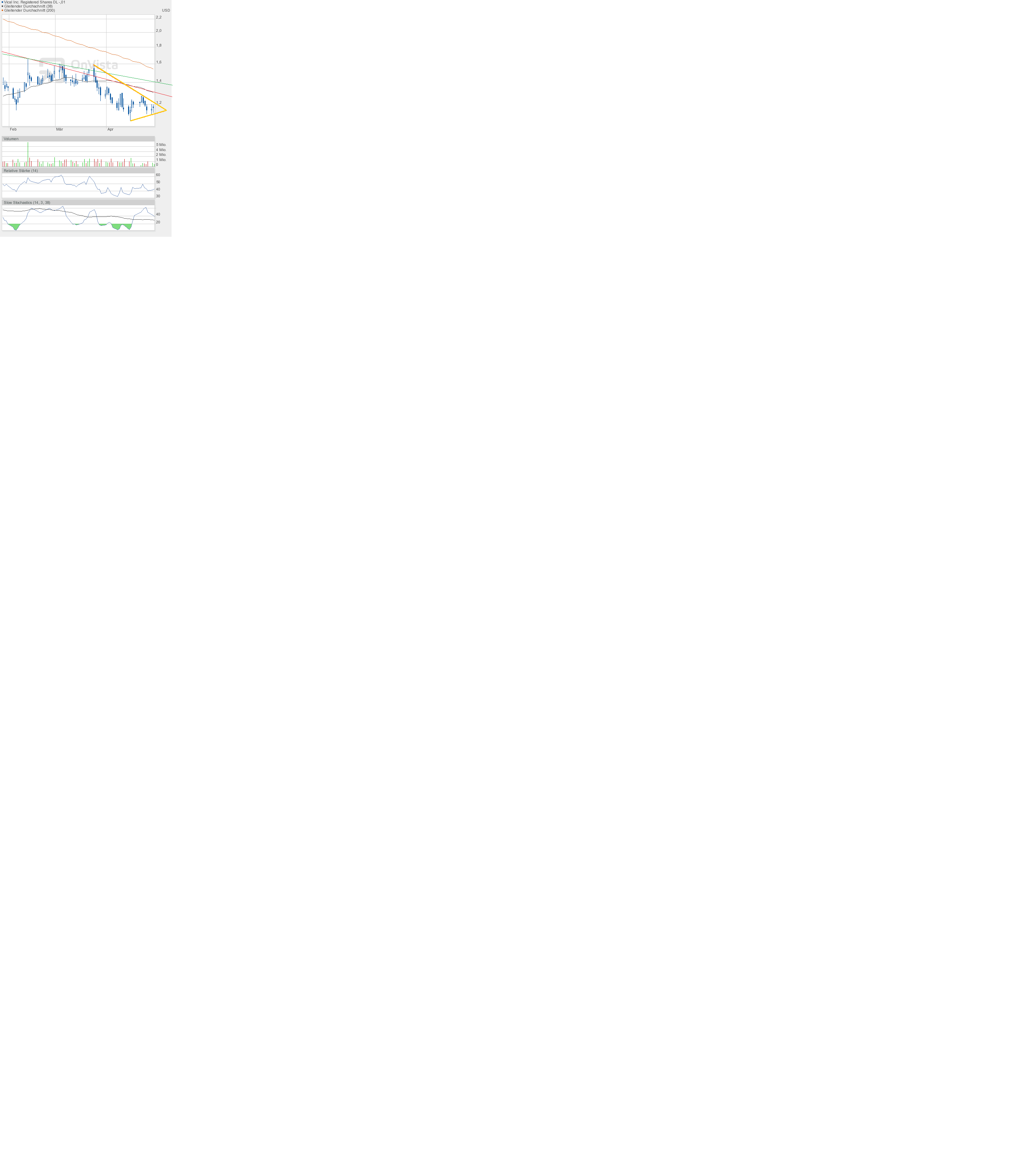 Aber es wird nicht lange dauern, bis wir eine große Bewegung sehen werden. Denn die 38- und 200-Tage-Linie kommen sich immer näher, und Vical scheint dazwischen gefangen. Spätestens wenn sie sich kreuzen werden, kommt es zu einer Trendentscheidung.