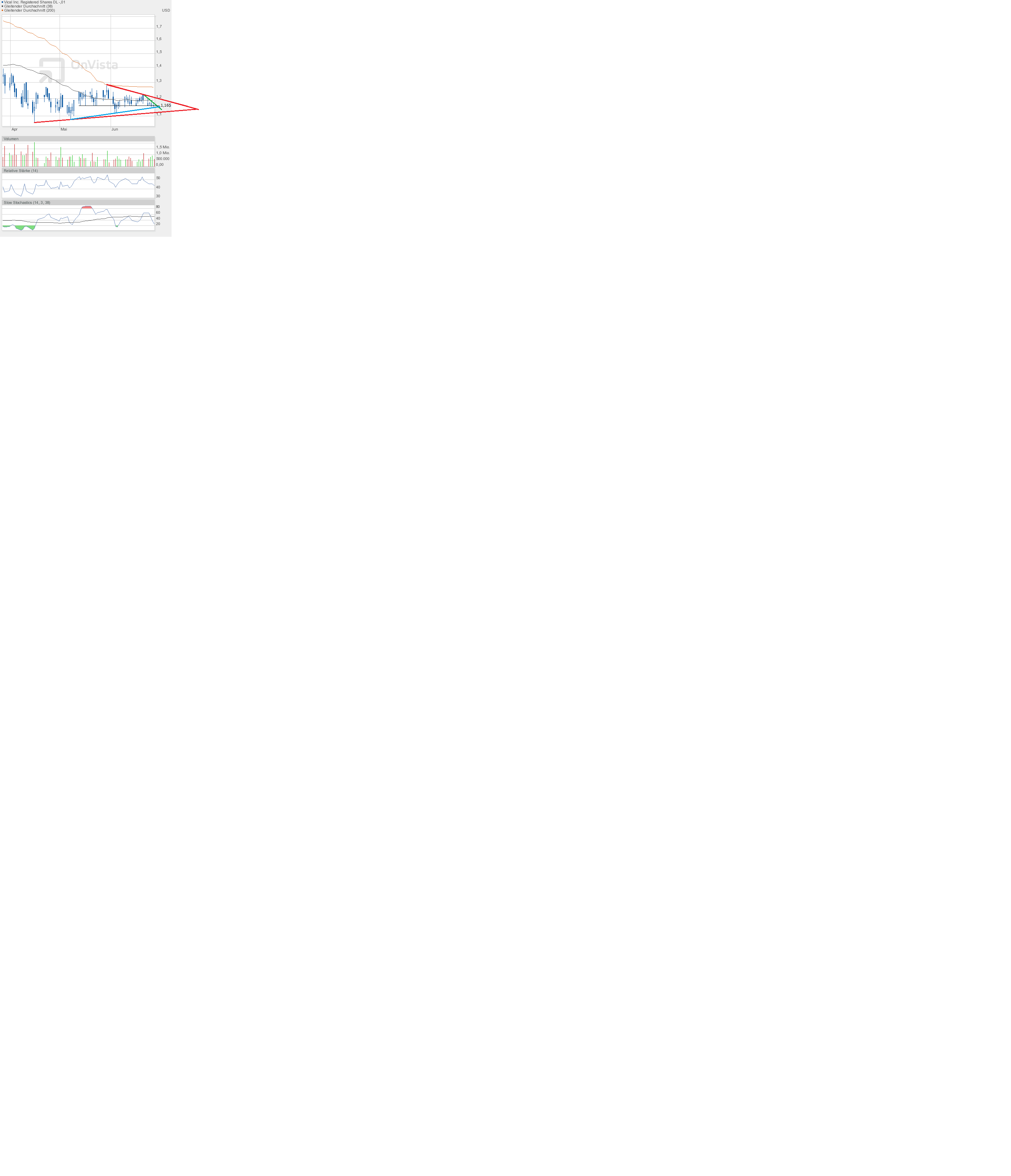 Der Keil im Keil ist heute wunderbar aufgelöst worden. Mit dem Eröffnungskurs von 1,15$ schön unten aufgesessen und nach oben weg - bis 1,19$, Schlusskurs 1,18$. Das liest sich nun nicht gerade als Wahnsinnsnachricht. Denn es ist irgendwo egal, ob Vical bei 1,15$ steht oder bei 1,18$. Und so ist es ja auch. Was der eigentliche Spaß des heutigen Handels war, das waren die letzten 15 Minuten. Das Volumen war ja schon seit längerer Zeit überwiegend alles andere als hoch. Aber um 21.45Uhr setzte auf einmal ein Aktienhandel ein, den ich so auch noch nicht gesehen habe. Das Gesamtvolumen von heute liegt bei gigantischen 5,5Mio Aktien. Und davon sind fast 5Mio allein in den letzten 15 Minuten über den Tisch gegangen. Letzte Order 3,6Mio Aktien. Wer macht denn sowas? Und vor Allem warum? Schwer zu sagen, ob hier Insiderwissen am Start war. Aber es riecht ordentlich danach. News habe ich bis jetzt noch nicht entdecken können. Man darf gespannt sein, was hier am Montag passiert. |