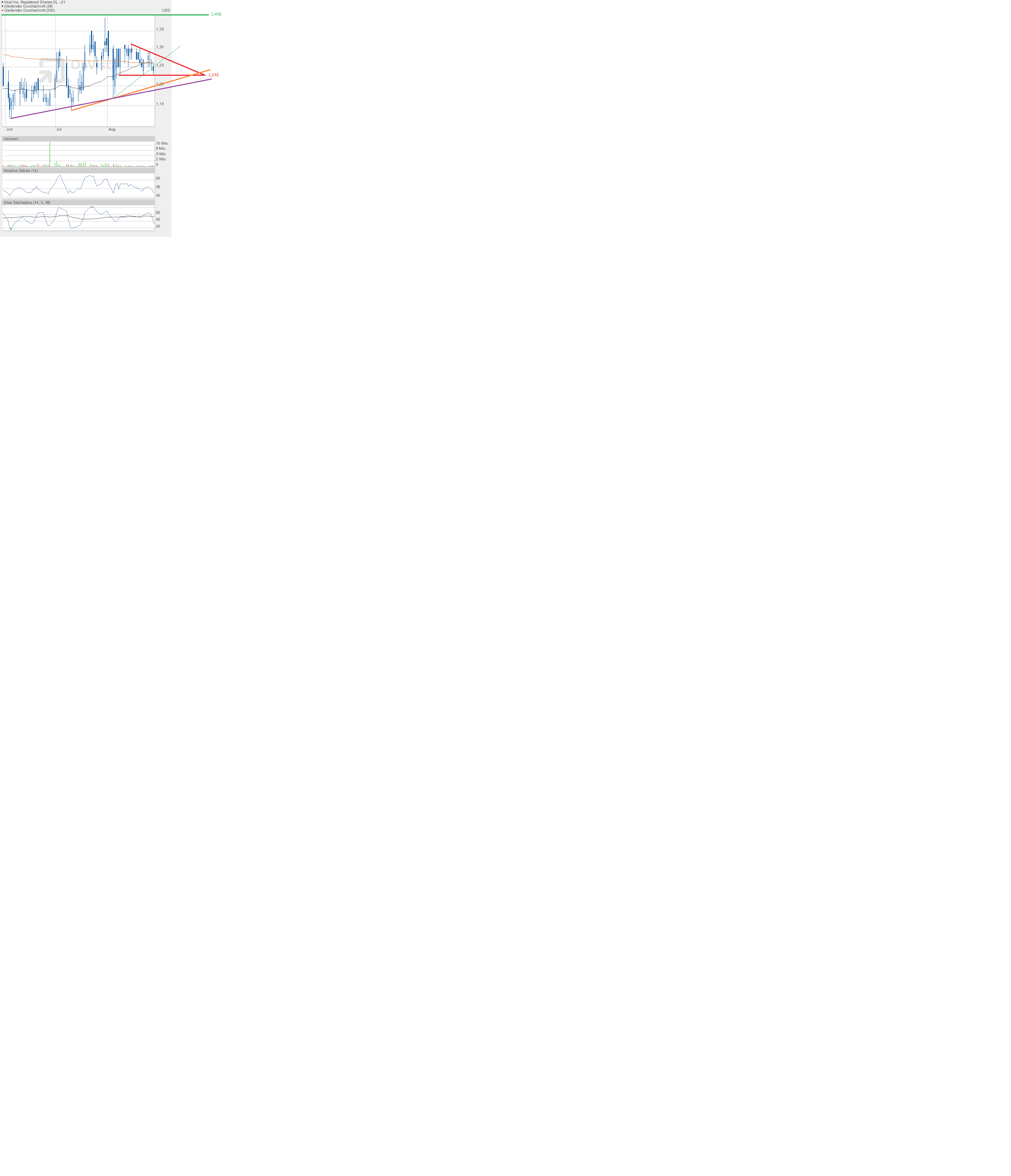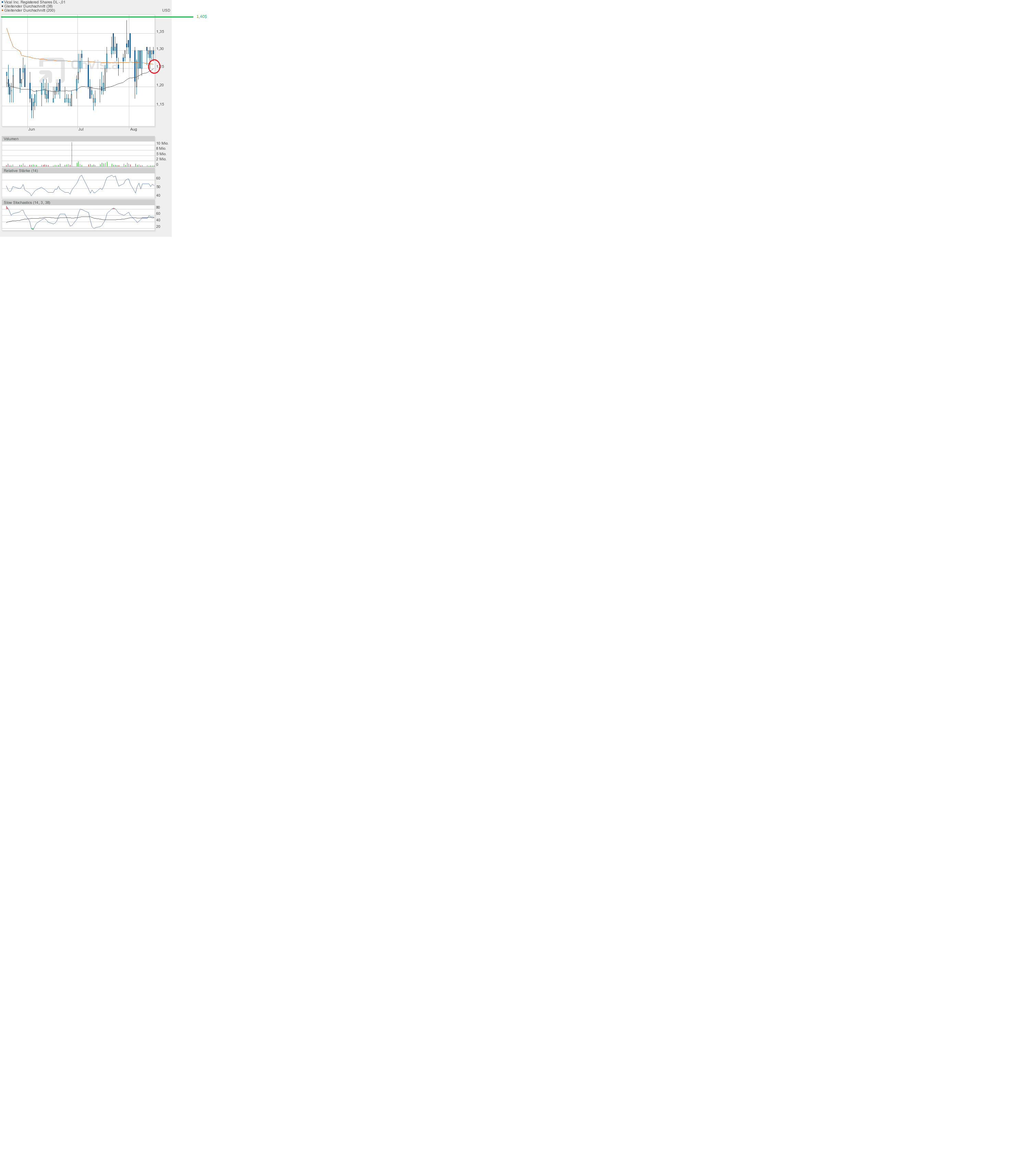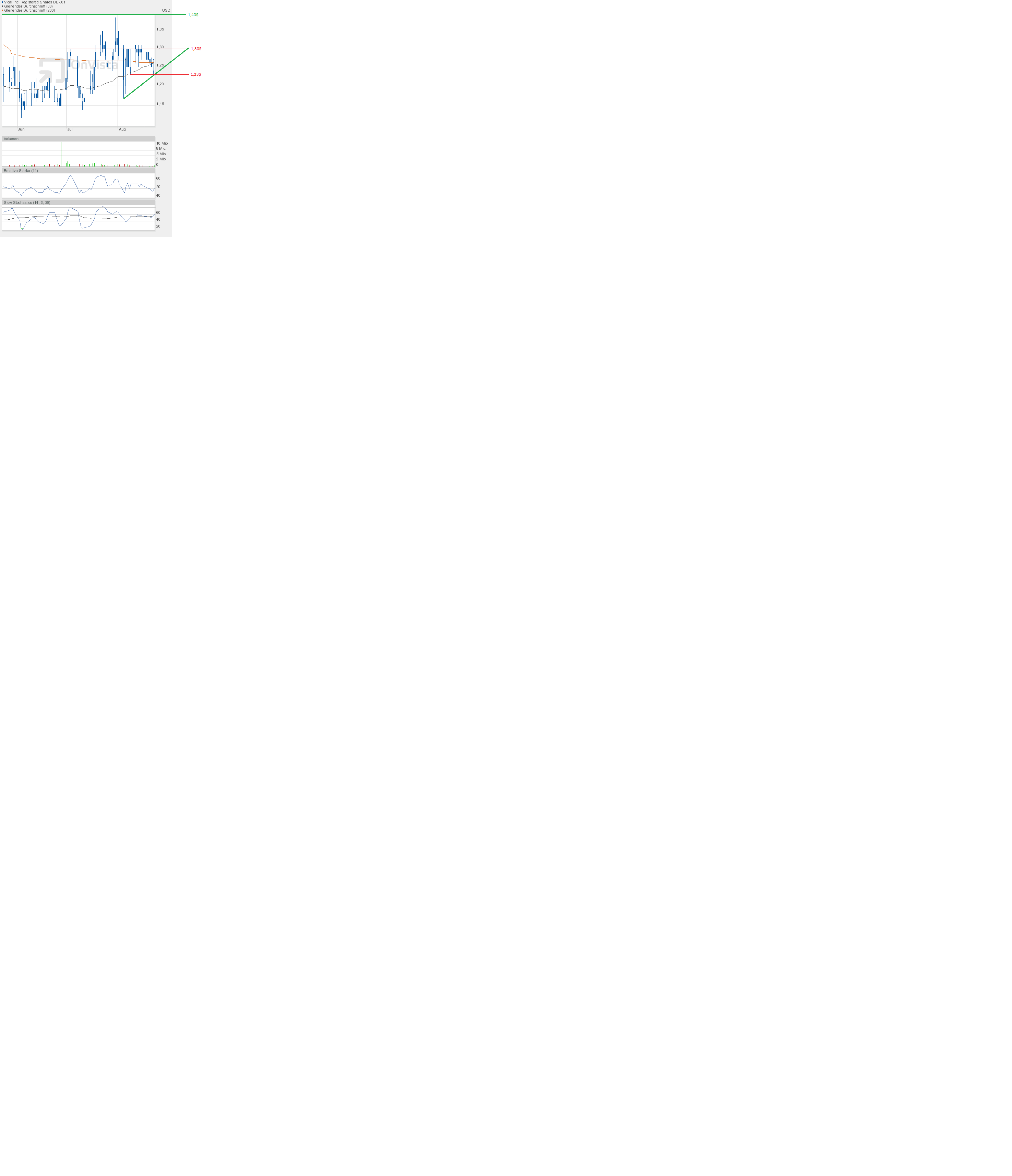 Den Versuch, die Kreuzung der 38-Tage- und 200-Tage-Linie zu verhindern, haben wir gestern tatsächlich gesehen. Tagestief 1,23$. Dabei hätte es auch schnell unter 1,20$ gehen können - ging es aber nicht. Um so schöner, dass die Aktie zum Handels- und Wochenschluss nochmal hochgekauft wurde. Schlusskurs 1,27$ auf Tageshoch, und damit über der 38-Tage- und 200-Tage-Linie. Die Indikatoren stehen weiterhin neutral, aber knapp über wichtigen Marken, was positiv erscheint. Damit ist die Kreuzung bei Durchschnittslinien nicht mehr zu verhindern, es sei denn am Montag brechen die Börsen crashartig ein, eher unwahrscheinlich. Für nächste Woche muss es das Ziel sein, irgendwie über 1,30$ zu kommen. Dann wäre auch 1,40$ denkbar, die Schlüsselmarke. Darüber erwarte ich einen Crash - nach oben. |