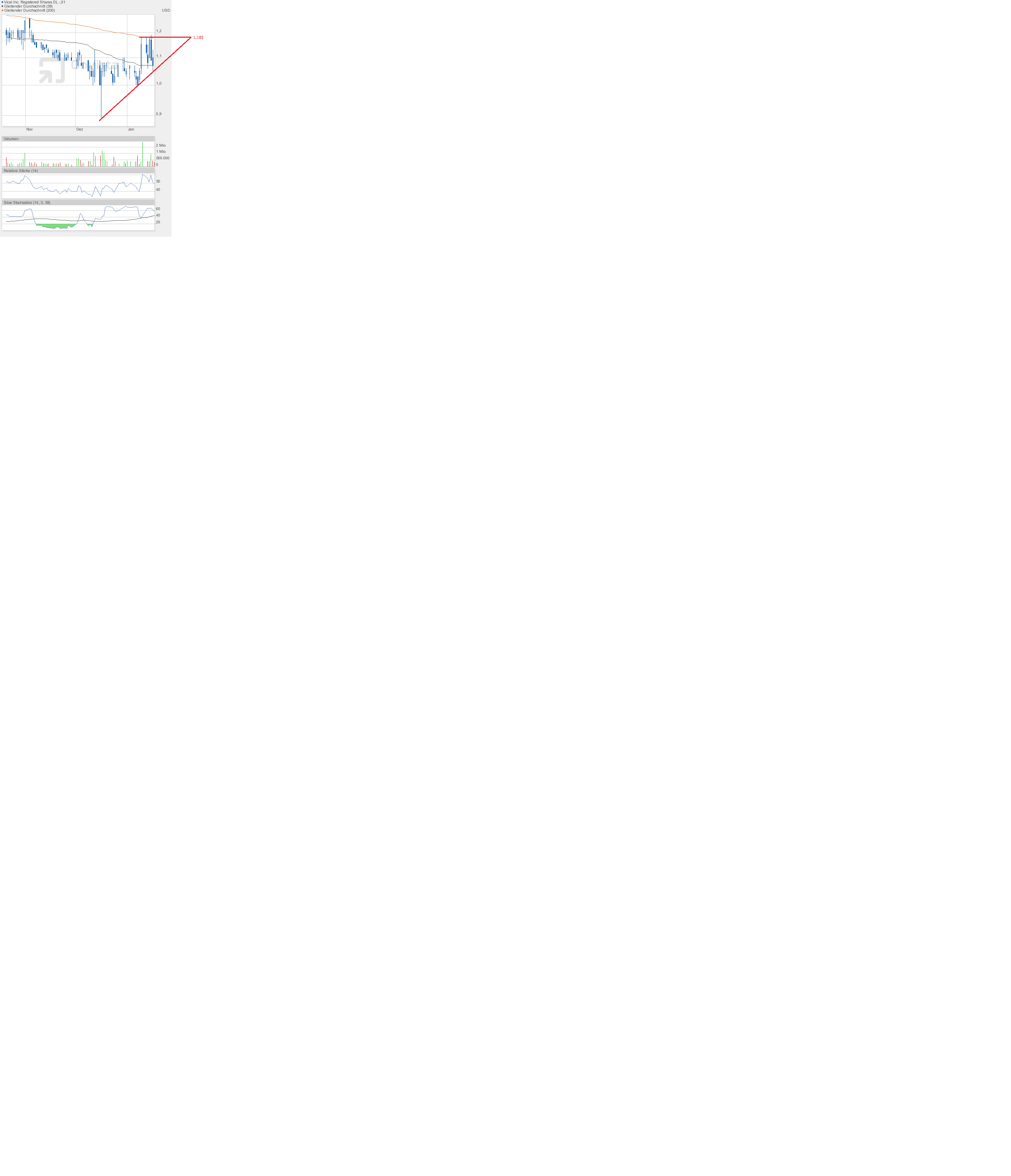 Aktueller Widerstand ist 1,18$. Dieser Kurswert ist der dort aktuell verlaufenden 200-Tage-Linie geschuldet. Es folgte eine Korrektur bis zur 38-Tage-Linie.