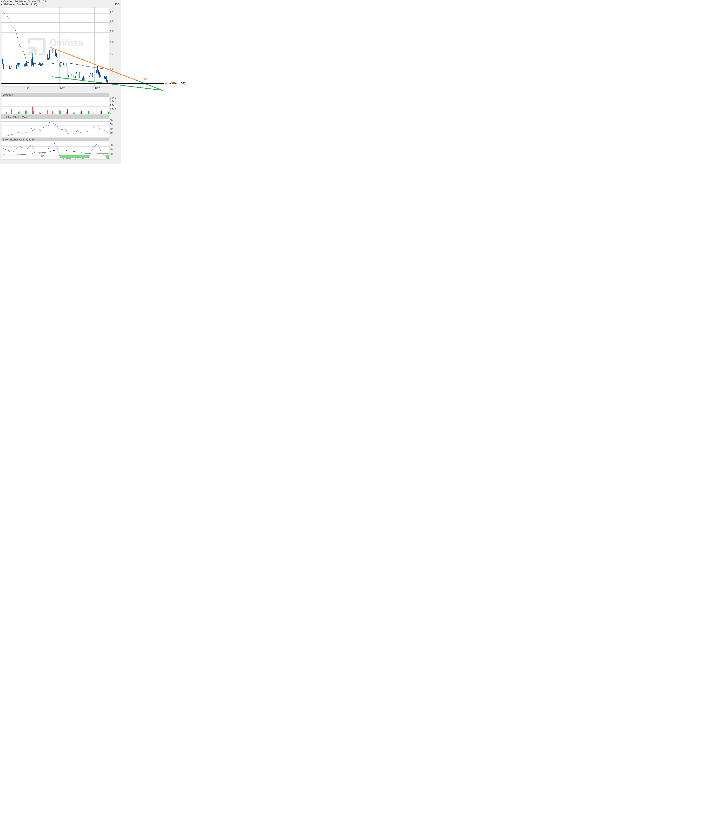 Es bleibt abzuwarten, ob das Allzeittief bei 1,04$ noch abgearbeitet wird, oder die rote abfallende Trendlinie das nächste Ziel darstellt.