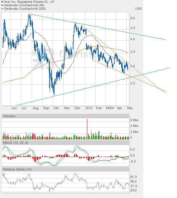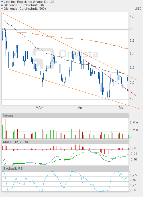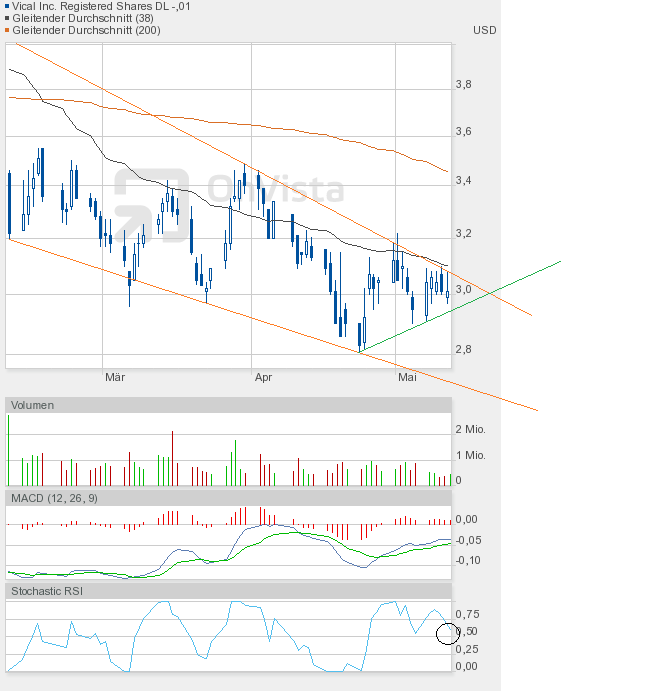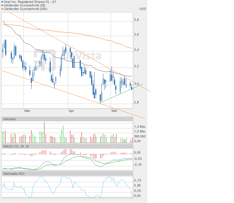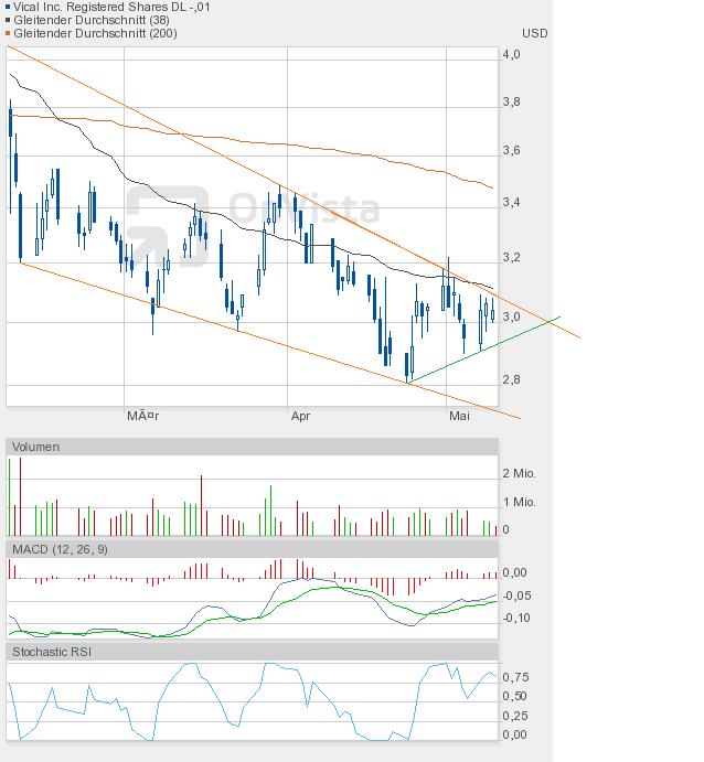 Wie man dem Chartbild entnehmen kann, steht die nächste Entscheidung vor der Tür. Wir sahen heute eine enge Handelsspanne, die sowohl Ober- als auch Unterbegrenzung des bullishen Keils annähernd auslotete. Kommt es in Kürze zum kleinen Ausbruch, also dem Fall unter die grüne Linie, dann wäre das auch kein Desaster, aber kurzfristig negativ. Und der Verbleib im bullishen Keil würde sich verlängern. Oder kommt es endlich zum großen Ausbruch, also zur Auflösung des bullishen Keils? Es dürfte dann eine Rallye-Phase beginnen. Ein Indiz dafür könnte der Stochastic RSI liefern, der sich heute auf 0,25 halbierte, obwohl Vical nur 1 US-Cent nachgegeben hatte. Schlusskurs 3,00$. Also Augen auf beim Eierkauf. |