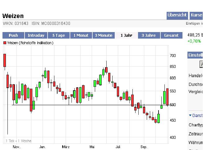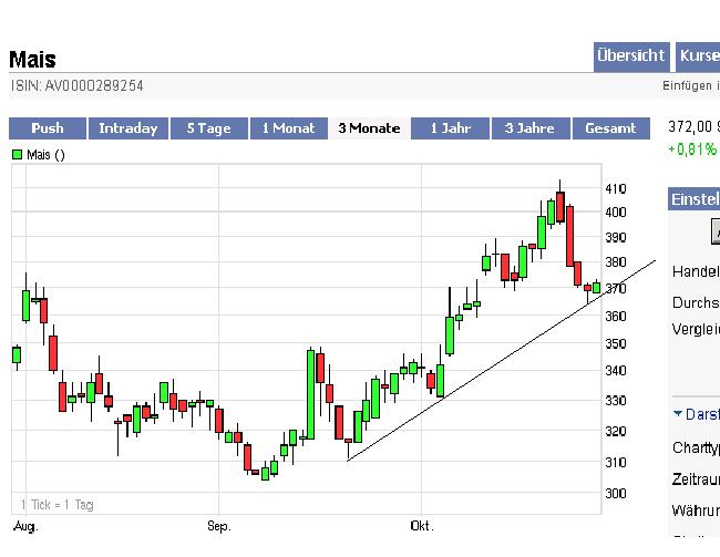 Die Chancen bei Mais und Weizen scheinen mir da gerade besser, weil beide eine Art Boden bilden Mais bei 365, Weizen bei 495. Könnten beide vielversprechende Punkte für einen Einstieg sein.