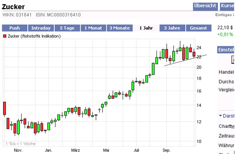 Schau Dir mal Zucker an... ist schön auf dem Widerstand aufgessessen, hat Potential für einen Einstieg auf Long. Fällt Zucker unter die 21,5 dann raus, ansonsten viel Spaß :)