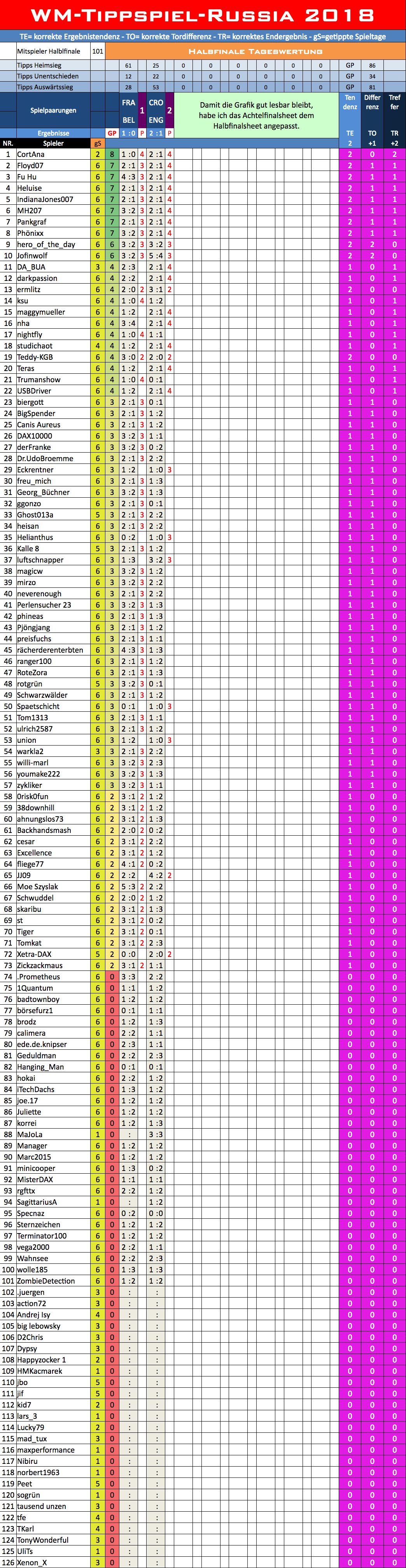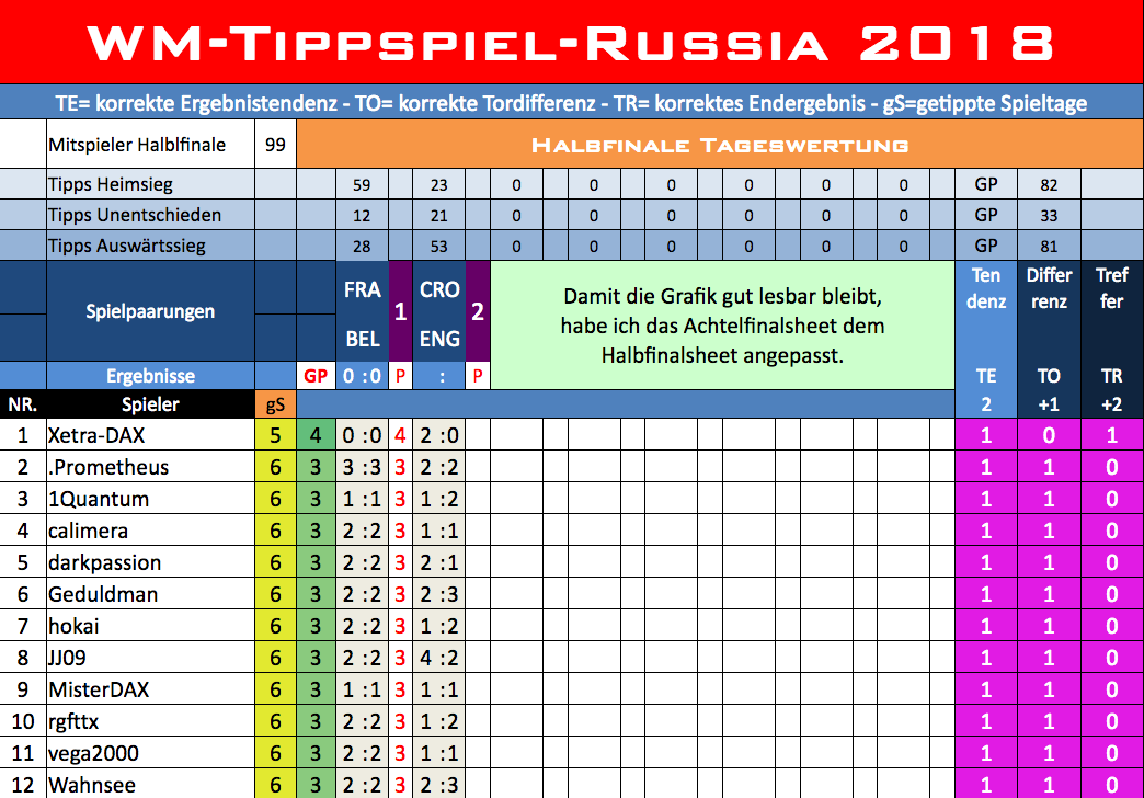 WM 2018 RUSSIA Tipprunde 6 - Fußball-Weltmeisterschaft - HALB-Finale : Sieger URU/FRA - BRA/BEL-Sieger (Di, 10.07.2018, 20:00) : Sieger RUS-CRO - SWE/ENG-Sieger (Mi, 11.07.2018, 20:00) Da die Zeit drängt, wird das Tippen auf das am Dienstag (10.07.2018) startende WM-Halbfinale jetzt schon eröffnet, obwohl das erste TippSheet derzeit noch WildCards enthält. Diese werden aber Zug um Zug durch die dann feststehenden Mannschafts-Namen ersetzt. Verwendet also bitte Alle stets das actuellste TippSheet ! - Tippen oder nachtippen könnt Ihr alle Partien bis 1 Minute vor ihrem jeweiligen Anstoß. Die selbe Frist gilt auch für das Ändern* bereits eingereichter Ergebnis-Ansagen (falls dafür Bedarf sein sollte).