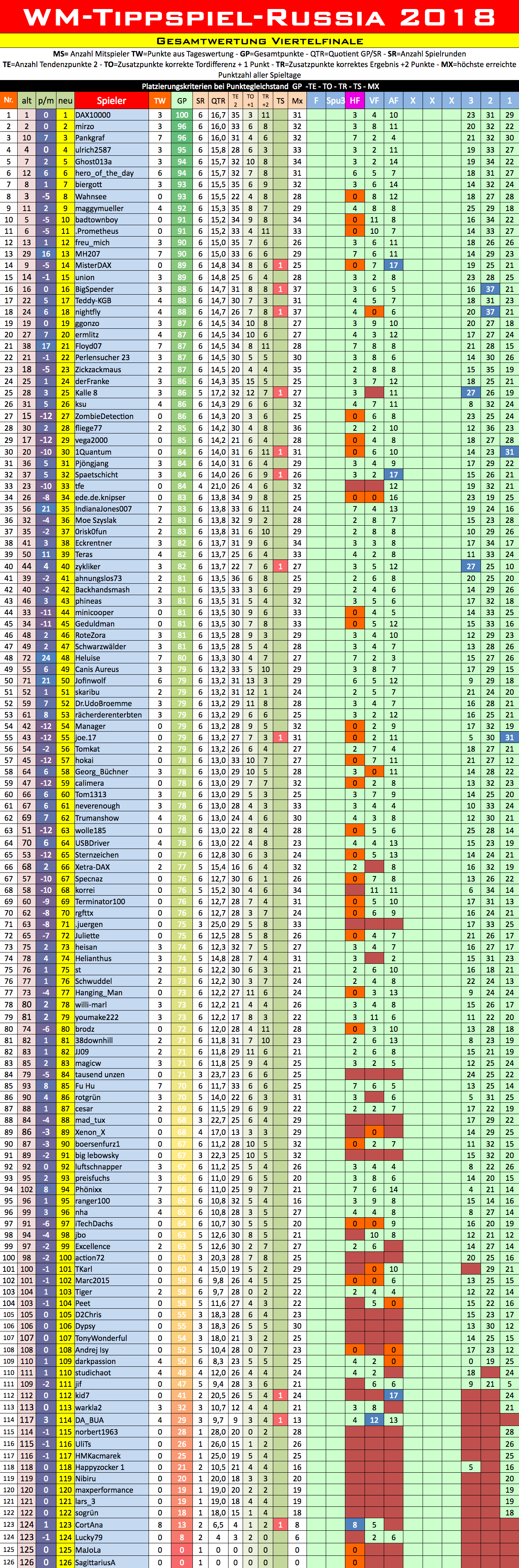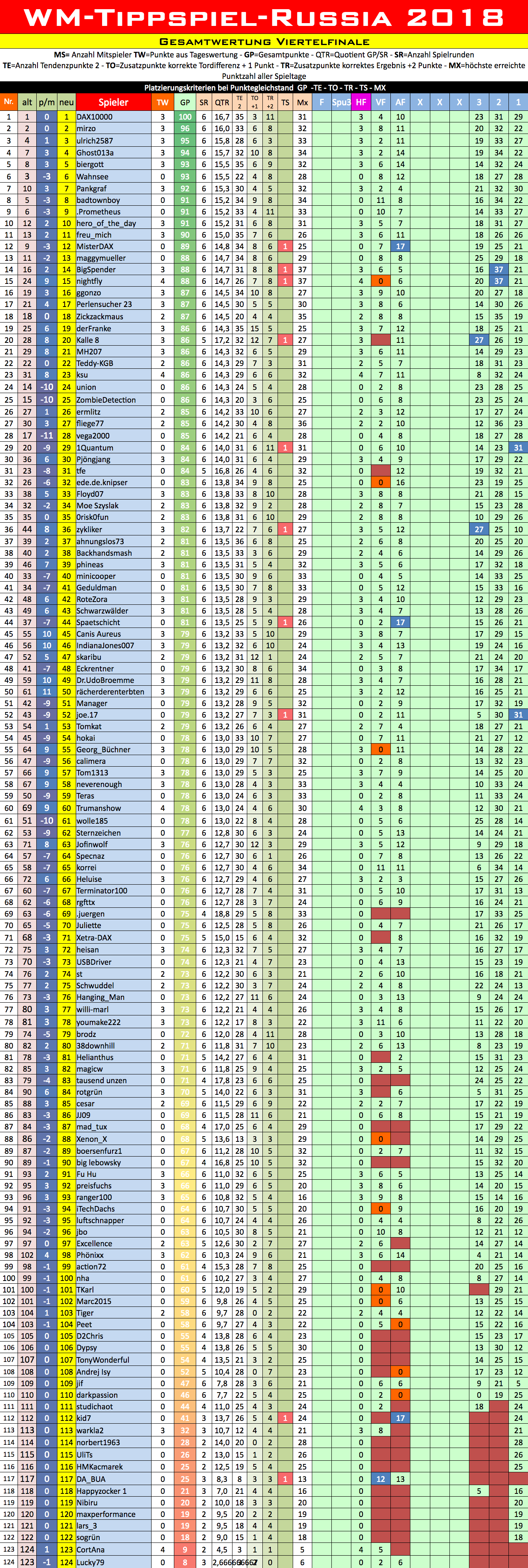 Die Auswertungen zur vorherigen WM-Runde 5 erfolgen dort: Fußball-WM 2018, TippR 5 Russia, Viertelfinale ... ----------- ⚽ ⚽ ⚽ Auf zur WM 2018 Russia ! ⚽ ⚽ ⚽ |
