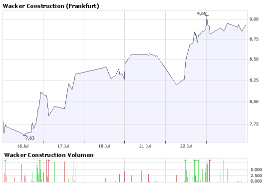 Die Aktie von Wacker Construction notiert derzeit in Frankfurt bei 7,45 Euro (-7,22 Prozent). (31.07.2008/ac/n/nw)