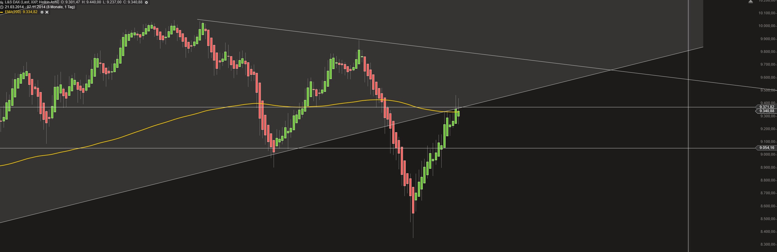 Ich habe mir heute den S&P 500 angeschaut. Der ist an einen steigenden Widerstand bei 2040 Punkten herangelaufen. Der DAX tut sich im Moment auch noch mit der 200-Tagelinie (FDAX 9350) schwer. Solange dies so ist, muss man (kurzfristig!) noch Vorsicht walten lassen.