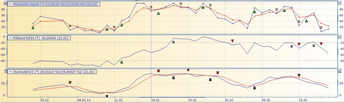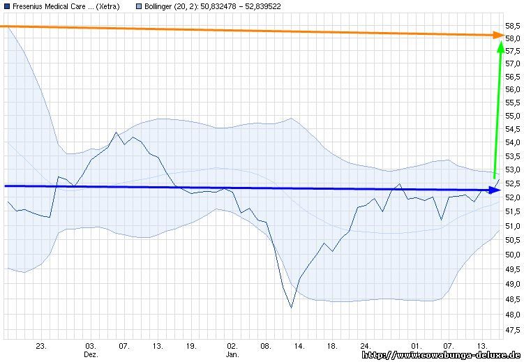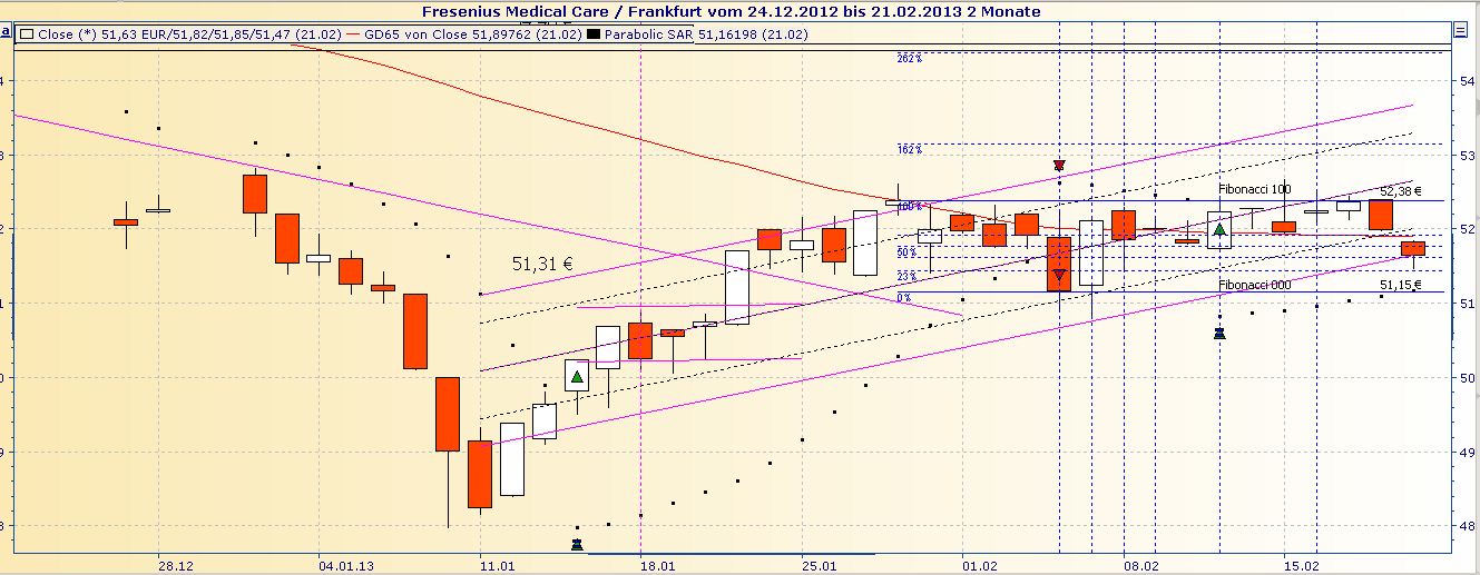 Wie ich oben bereits feststellte, befand sich der Kurs im überkauften Bereich; das hat sich mittlerweile so herausgestellt, und es hat sich leider auch noch nicht geändert. Der Kurs bewegt sich im Fibonacci-Kanal (oben 52,38 € und unten 51,15 €); zwischenzeitlich hat er mal einen Ausbruchsversuch gewagt (52,70 €), doch hier prallte er sofort wieder nach unten ab; der Durchbruch nach oben lässt noch auf sich warten, da helfen auch keine grünen Pfeile, die nach oben weisen. Dennoch bin auch ich der Meinung, dass irgendwann der Durchbruch nach oben kommen kann (wenn der Gesamtmarkt dieses zulässt), doch zuvor könnte noch die untere Fibonacci-Grenze wieder getestet werden; diese wird jedoch aus meiner Sicht halten, denn dafür ist FMC fundamental zu gut bewertet.