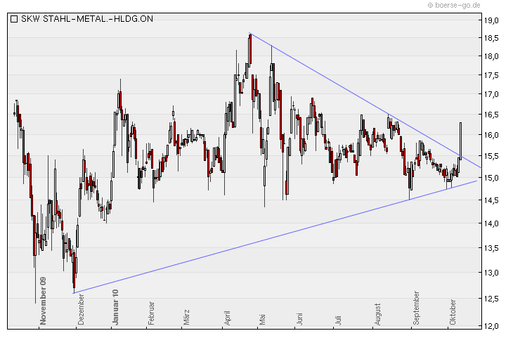 Rückblick: Vom Allzeittief bei 6,88 Euro im März 2009 erholte sich die SKW Stahl Aktie sehr deutlich, nach einem schnellen Anstieg bewegt sie sich seit Juli 2009 in einem flachen Aufwärtstrendkanal nach oben. Nach dem Jahreshoch bei 18,60 Euro im April konsolidierte der Wert seitwärts oberhalb von 14,50 Euro, bevor im Oktober die nächste Kaufwelle startete.
