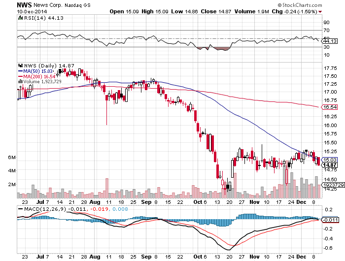 Als Tickerzuordnung für diesen Thread habe ich News Corp. (NWS) gewählt - eine Firma, die u. a. die US-Version des Wall Street Journals herausgibt. NWS fiel in 2014 gegen den Uptrend der großen US-Indizes: