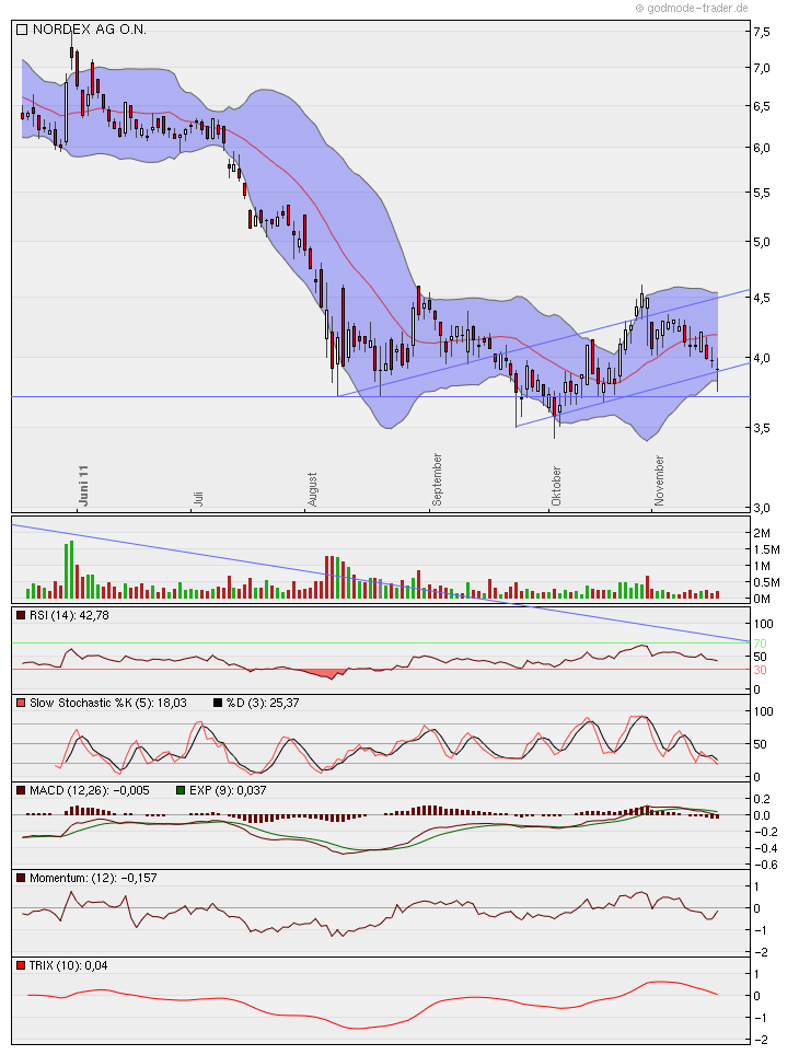 keine guten Aussichten..Nordex scheint ja vielen Analysten ein "" DORN "" im Auge zu sein, im Moment sagen viele Firmensprecher eine sinkende oder Stornos voraus aber längst nicht alle diese Aussagen lassen deren Aktie so absaufen wie Nordex. 4 Jahre Abwärtstrend ist genug http://www.wallstreet-online.de/nachricht/3742993-nordex-rutscht-weit-gehen Rückblick: Die Nordex Aktie brach Ende Oktober dynamisch über den EMA50 (blau) aus, das erste Mal seit Juni, und kletterte anschließend bis an den Widerstandsbereich der letzten Zwischenhochs bei 4,49 Euro. Dort prallte der Wert wieder nach unten hin ab und stabilisierte sich in den vergangenen zwei Wochen dann im Bereich des EMA50 (blau) oberhalb von 4,00 Euro. Heute kommt stärkerer Verkaufsdruck auf, die Aktie rutscht unter die Tiefs der letzten Wochen zurück, womit sich das kurzfristige Chartbild wieder deutlicher eintrübt. Charttechnischer Ausblick: Im Chart ist das bärischste Szenario eingezeichnet. Demnach ist die Nordex Aktie nun wieder anfällig für fallende Kurse bis zum Jahrestief bei 3,428 Euro. Geht es auch nachhaltig unter dieses Tief, wird ein weiterer Kursrutsch bis zum Unterstützungsbereich bei 2,94 - 3,03 Euro möglich. Im bullischsten Falle fängt sich der Kurs auf aktuellem Niveau wieder und startet eine deutliche Erholung. Bei einem Tagesschluss oberhalb von 4,14 Euro wäre ein erneuter Anlauf auf die 4,49 Euro-Marke möglich. Oberhalb davon ist Platz bis zum EMA200 (rot) bei aktuell 5,19 und später ggf. sogar 5,95 - 6,05 Euro. |
