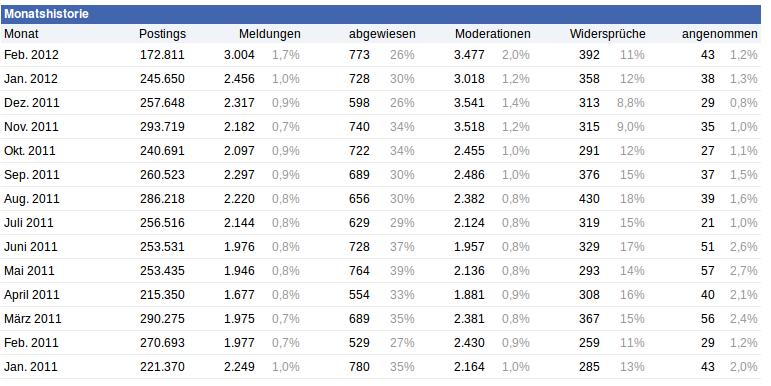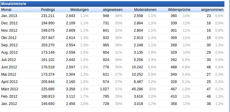Juni 2009 157.267 2.074 1,3% 767 37% 1.809 1,2% 282 16% 17 0,9% Mai 2009 143.056 1.636 1,1% 569 35% 1.567 1,1% 205 13% 5 0,3% April 2009 131.414 1.587 1,2% 673 42% 1.739 1,3% 283 16% 16 0,9% März 2009 135.275 1.283 0,9% 472 37% 1.422 1,1% 196 14% 4 0,3% Feb. 2009 119.979 1.945 1,6% 626 32% 1.989 1,7% 327 16% 28 1,4% Jan. 2009 137.942 1.873 1,4% 657 35% 1.878 1,4% 363 19% 26 1,4% Dez. 2008 104.415 1.179 1,1% 517 44% 1.310 1,3% 231 18% 36 2,7% Nov. 2008 221.690 1.148 0,5% 487 42% 1.007 0,5% 215 21% 26 2,6% Okt. 2008 139.958 787 0,6% 350 44% 653 0,5% 83 13% 6 0,9% Sep. 2008 119.743 1.197 1,0% 516 43% 1.227 1,0% 161 13% 15 1,2% Aug. 2008 96.875 |