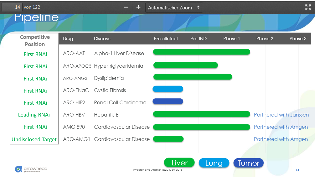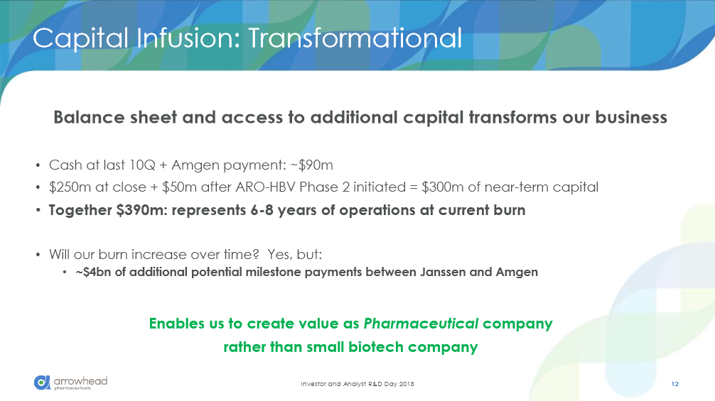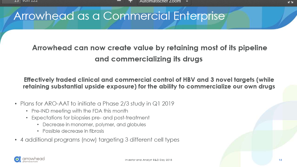 Here's a summary from behind the scenes – all of the things you didn’t hear online. I found the overall mood of the room to be very positive, particularly as it pertained to the future of Arrowhead. 1) I was able to confirm with the CEO that none of the 4 candidates that were being discussed (APOC3, ANG3, ENaC, and HIF2) included triggers from the Novartis acquisition. The reason I asked is because 3 of the candidates have patents and patent applications that show up in patent searches that stem from Novartis, but it appears that Arrowhead developed their own triggers. This is actually great news, because the patent life won't be shortened by the Novartis filing dates. This allows for longer patent protection for these candidates. 2) A hedge fund analyst I spoke with told me that the reason they invested in Arrowhead is because of the latest drop in price after the announcement of the JNJ deal. They're interested in oligo technology and they believed this latest drop was a fantastic buying opportunity. The one big piece of information he relayed to me is that they look closely at competing drugs across different technology sectors, as this could greatly affect the valuation when results from all these competitors get released. They were especially interested because Arrowhead appears to be operating in areas that are less crowded. He was especially intrigued when Arrowhead addressed this concern during the presentation. Not sure if you remember, but Arrowhead mentioned during their presentation (and in a private discussion I had with Bruce Given afterwards) that they screen their drug candidates on whether they can be addressed through other modalities, such as monoclonal antibodies (mAbs). If the condition could be addressed by mAbs then Arrowhead doesn't pursue it because of not only increased competition, but it also has proven success with the FDA and approval could be quicker and easier for mAbs. Hence, Arrowhead pipeline candidates intend to limit their competition from the start to only other RNAi companies. This makes it much easier for Analysts to stay on top of the competition, as an unintended competitor in a different space should not arise and affect the valuation. (On a personal note, I find this to be fantastic) 3) I met with an analyst representing one of the top institutional investors. Their take on the latest drop in stock price was more about the market dropping as a whole that amplified the JNJ news. Needless to say, they’re still in and a believer in Arrowhead. 4) When Arrowhead finally started to present, you could tell that they were fully confident in what they had and how the future will develop. Not surprising, as they just secured plenty of non-dilutive funding. Not sure how the CEO came across in the presentation online, but he was clearly telling the analysts in that room that they are a force to be reckoned with. I believe many others here nailed this analysis correctly. 5) After the presentation, I had a discussion with Bruce Given regarding a few aspects of their technology. One concern of particular was the development of dual triggers (like the one they have for ARO-HBV), and whether or not one of the triggers could have a dominant or competing effect over the other. He said that they screen for this in advance and they are careful to avoid such a combination. Hope this summary helps. I know I may be sounding a lot like a cheerleader, but it’s hard not to after what I just saw. Management did a great job of anticipating the concerns of the analysts – they addressed patient groups, toxicity, development methods, candidate selection, trial designs, and they even make it easy for an analyst to identify competition. Comprehensive, sharp, and smart. https://finance.yahoo.com/quote/ARWR/community?p=ARWR |