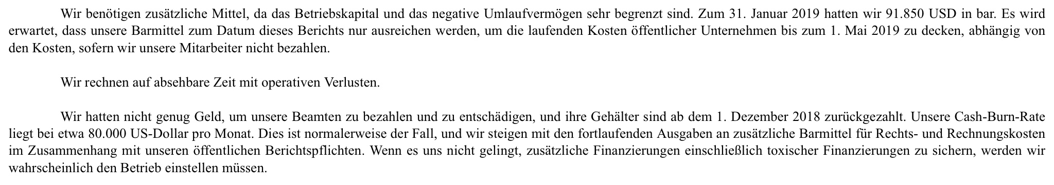 Am 5. April 2019 reichte das Unternehmen beim US-Außenministerium von Nevada ein Änderungszertifikat seiner Satzung (die „Änderung“) ein, um eine 30-fache Umkehrung der Stammklasse des Unternehmens durchzuführen. Die Änderung trat am 9. April 2019 in Kraft. Als Folge der Änderung werden keine Spitzenaktien ausgegeben oder verteilt.