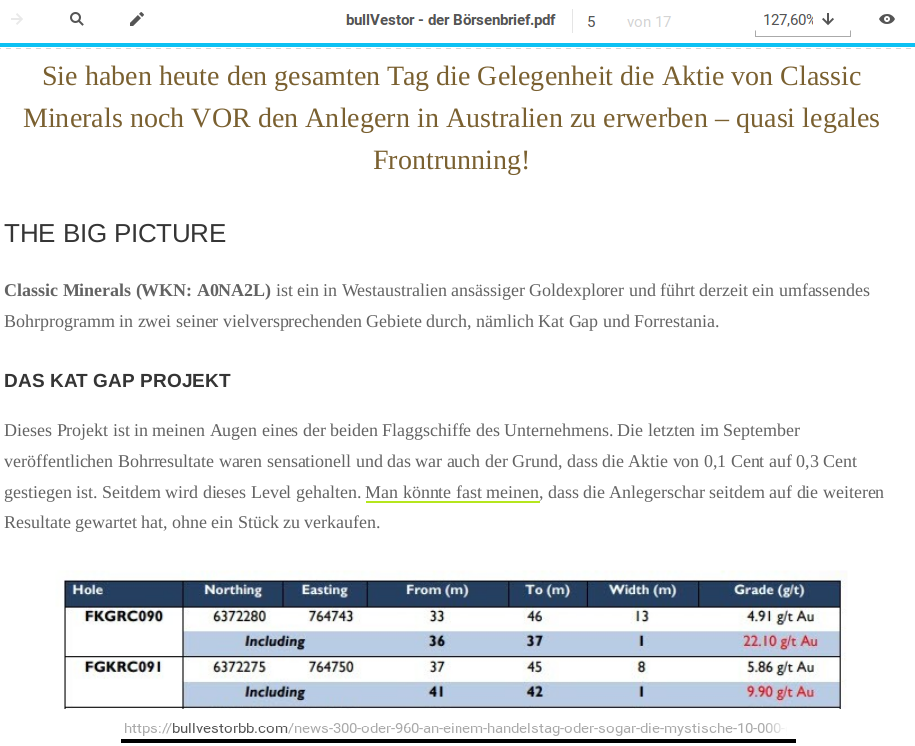 | Kein Problem, sollte von mir kein Angriff sein, falls es so rüberkam sorry,l. Ja der Bollinger hat leider einen bitteren Beigeschmack, denn der bringt wirklich keine gescheite aktie raus, hab mir damals einmal die Finger mit Canada Zinc heute heißt diese Zink Res.... die Finger verbrennt. Aber naja was soll man sagen. Ps: Diesmal bin ich schon vor dem Bullen Investor Bolli dabei weil die Goldwerte wirklich Top sind und der Eckhof 180 Mio Shares gekauft hat. Das war meine Motivation, vielleicht hat der Bolli diesmal Glück weil er sich an Eckhof anlehnt. Von den Bohrergebnissen bin ich einfach überzeugt, dass Classic wirklich höher bewertet gehört und der Aktienkurs derzeit das Potenzial nicht einmal Mal minimal widerspiegelt. Wenn die weiteren Bohrungen passen, dann kann es los gehen. Mal schauen the time will tell :) |