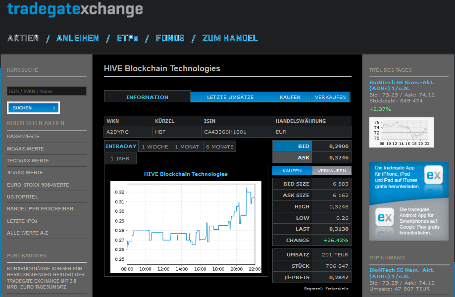 An der Heimatbörse wurden gestern nämlich weit über 3,5 Millionen HIVE-Aktien gehandelt, entspricht einem durchschnittlichen Umsatzplus von 50%!