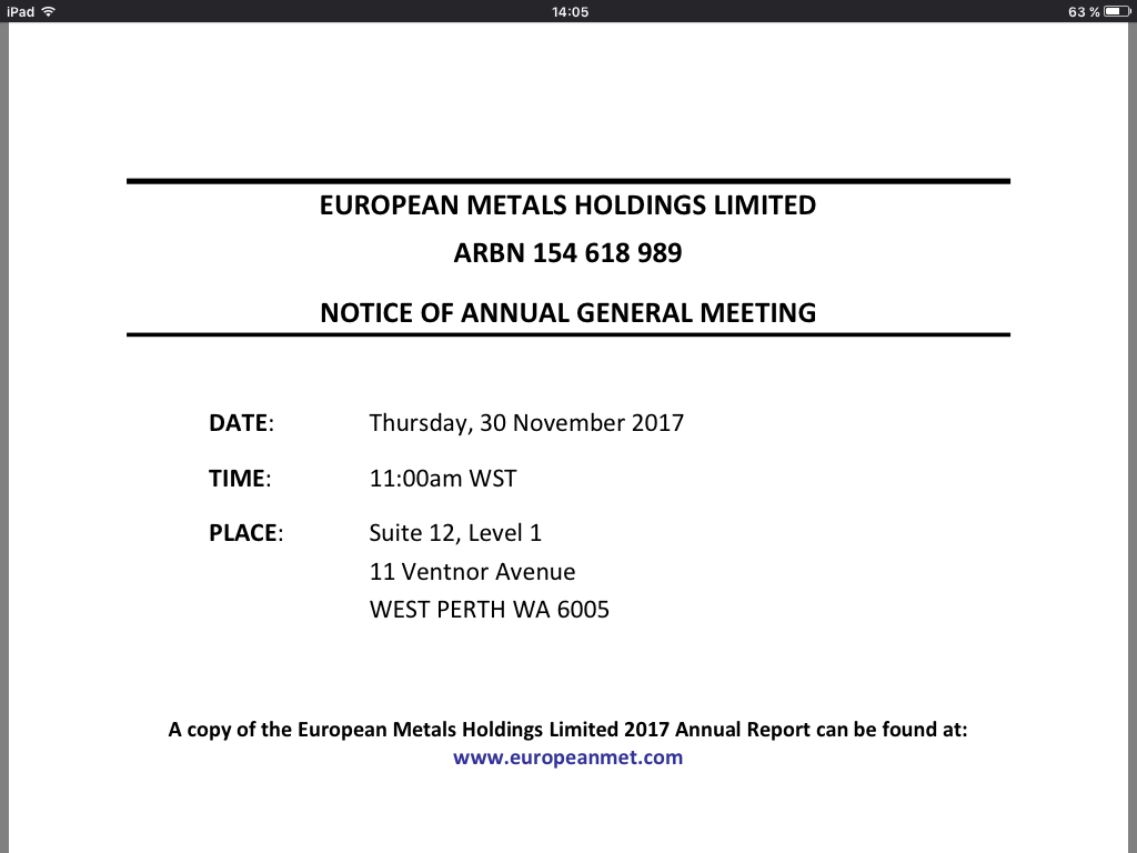 ERKLÄRUNG EUROPEAN METALS HOLDINGS LIMITED