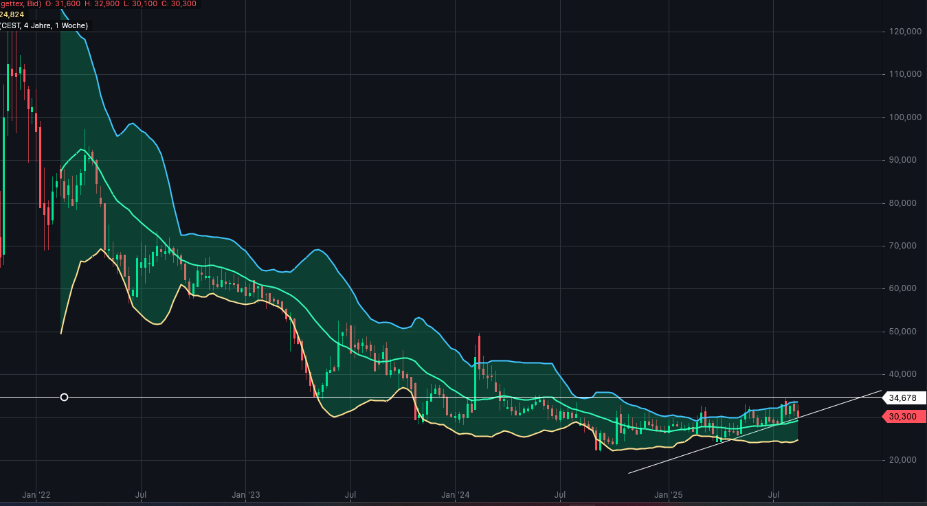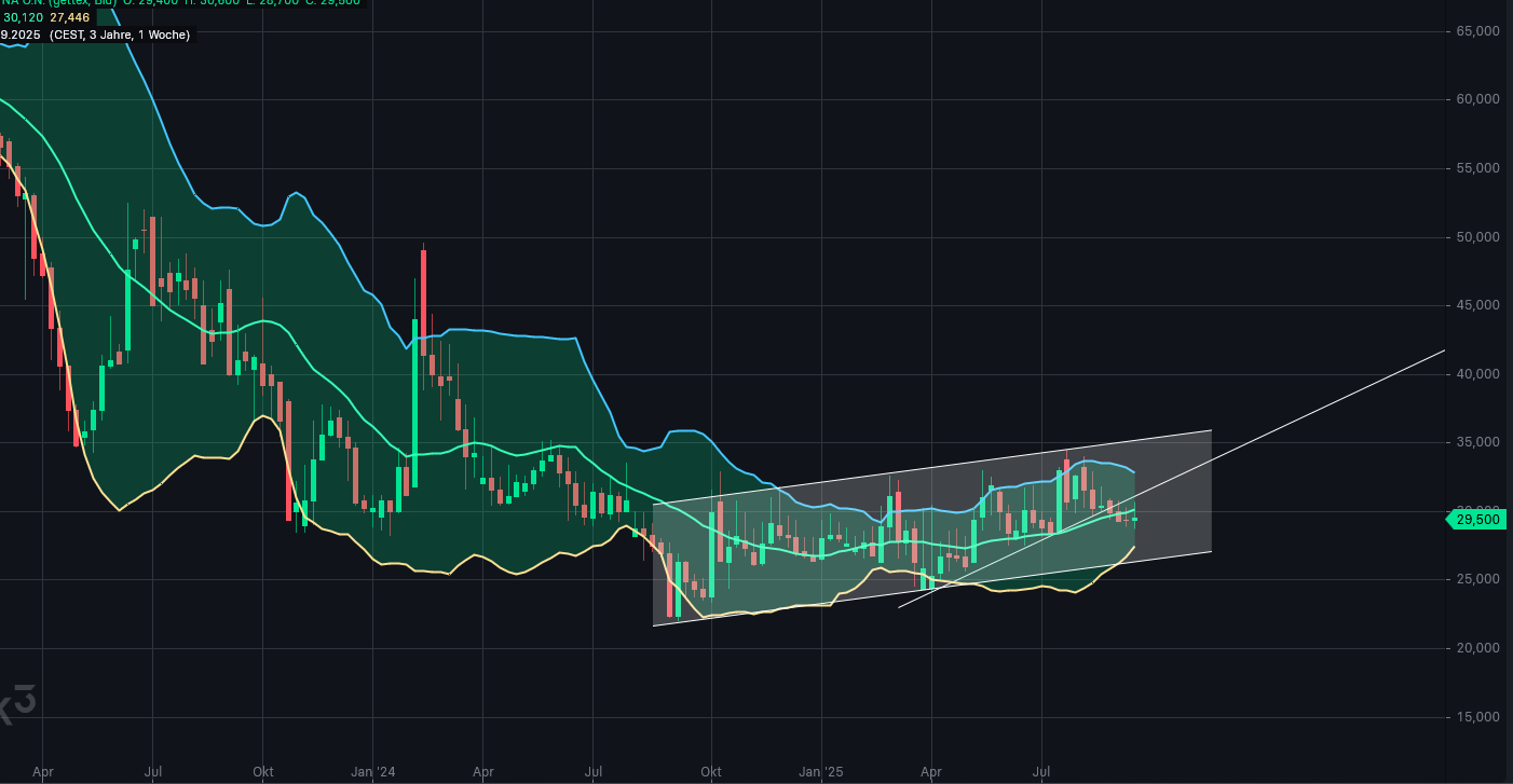 hier ein aktueller Chart des Geschehens. Die Aktie ist auf dem Weg zum Zwischenziel bei ca. 35 Euro. Sie hält sich wacker über 30 Euro und sollte hier nun möglichst wieder nach oben drehen, da sonst der Bruch des noch jungen Aufwärtstrends von Anfang 04/2025 droht. Ebenso verläuft hier der EMA 50, welcher als Unterstützung dienen sollte. Zum "Golden Cross" kam es ja bereits mitte Mai und wurde bisher bestätigt. Soll heißen, dass nun alle kleineren EMA´s über den Größeren verlaufen. Der obere Rand des Bollinger-Bandes wirkt im Moment begrenzend. Das sollte sich bei positiven Verlauf bald ändern. Schlechte Nachrichten seitens des Unternehmens gibt es bislang nicht. Für mich läuft alles nach Plan - Man sollte hier Geduld mitbringen!!!