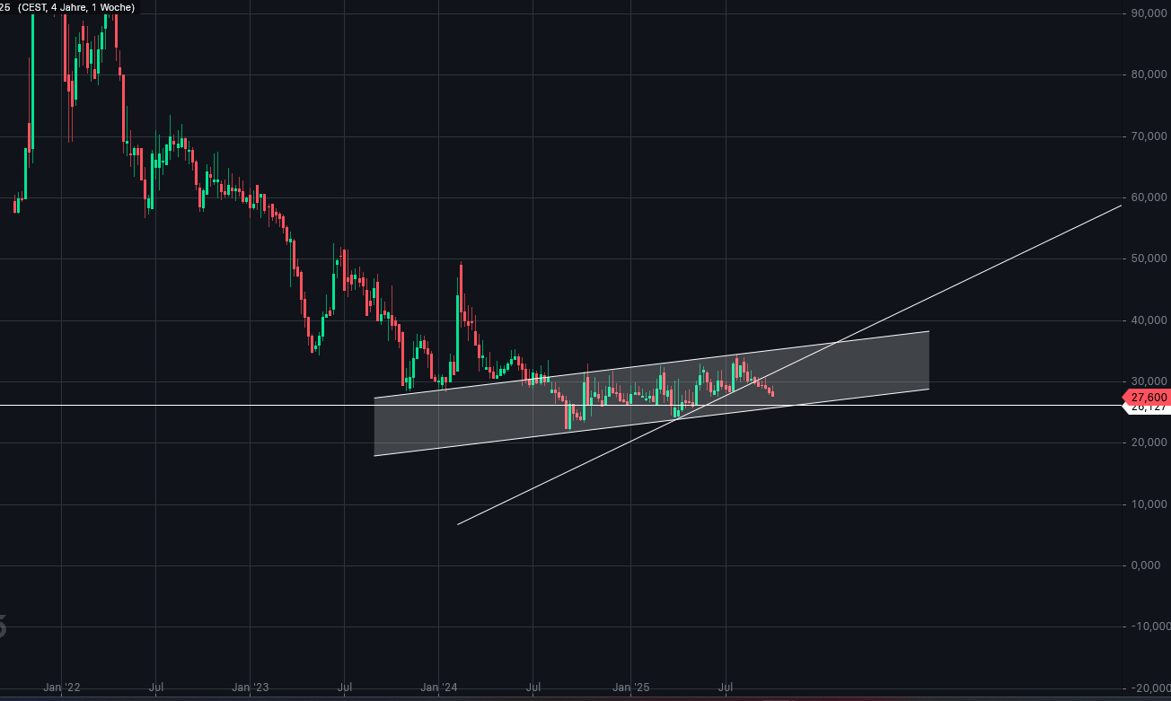 Die untere Begrenzung des intakten Trendkanals liegt bei ca. 26 Euro. Und ich habe geschrieben, dass diese vielleicht getestet wird. Ob der Kurs an dieser Stelle wieder nach oben dreht oder der Trendkanal nach unten verlassen wird, das kann man nicht sagen. Es könnte ein guter Einstiegszeitpunkt sein oder aber nicht. Es entscheidet jeder selbst, wie er darauf reagiert bzw. was er daraus für sich ableitet.