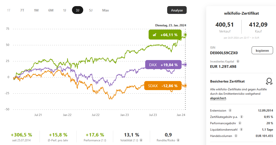 Fällt mir jetzt erst so richtig auf als ich mal die Funktion bei wikifolio genutzt habe, mein Wiki mit Dax und SDax zu vergleichen. Auf drei Jahre -13%. Da sieht man mal, wie schlecht eigentlöich deutsche Nebenwerte gelaufen sind.